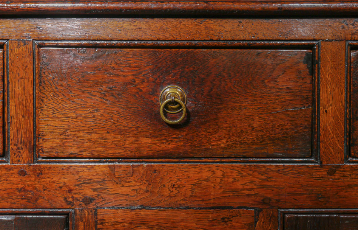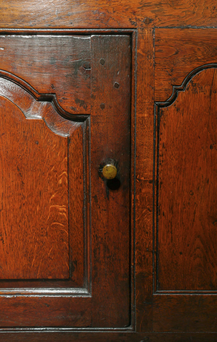 Three small working drawers above a fixed central panel flanked by a pair of cupboard doors, with exceptional arched and raised panels (the doors contain a lovely concealed locking mechanism). Again, like most Welsh furniture, the joiner has used oak for all his drawer linings, backboards and bottom boards.