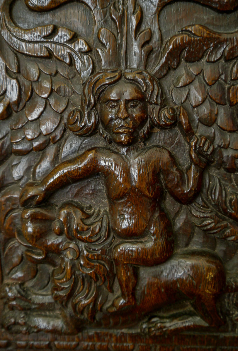 Above the figures are a pair of stylised birds, back to back with richly carved feather detail.