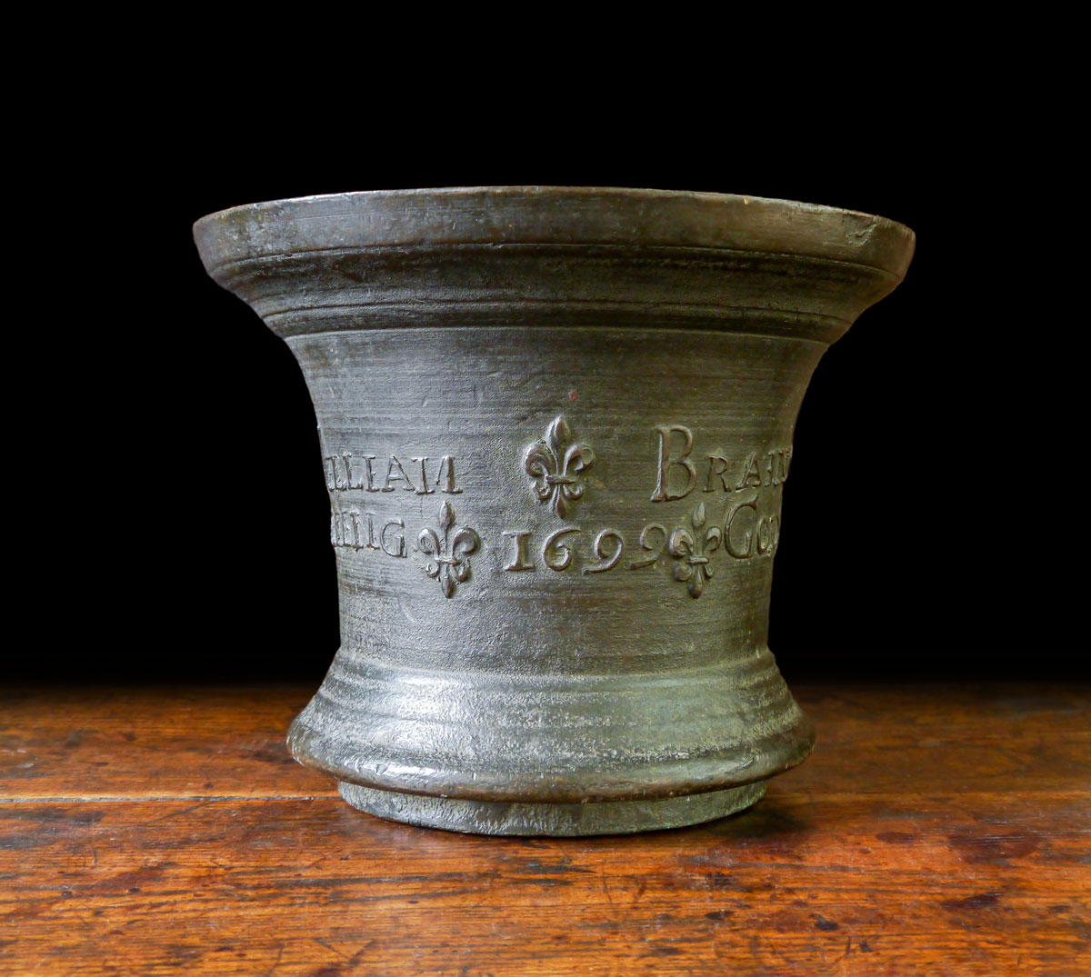 Having wonderful proportions, this much documented late 17th century mortar is cast for William Brainch, the date 1699 and the motto “God Direckt Mee in My Beginning”.