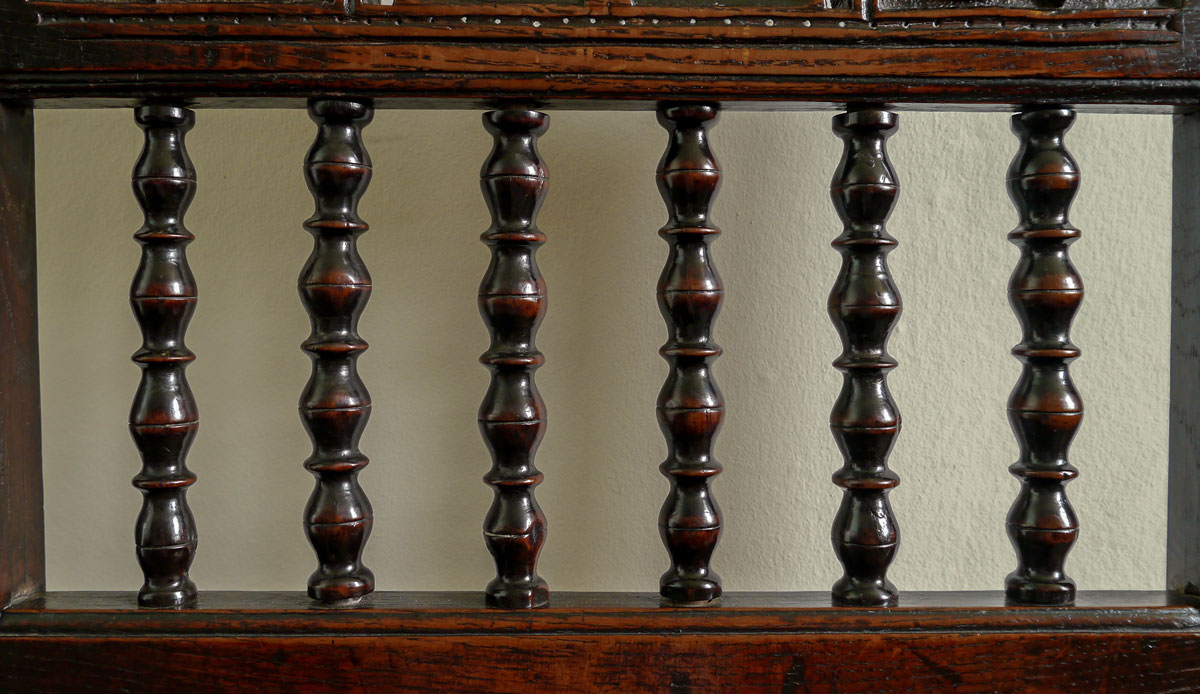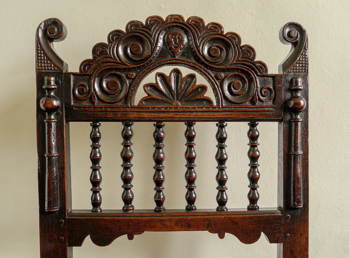 Note – it is not unusual to find a carved “mask” in the centre of the top splat, often thought to be the face of Charles I. However, of all the masks I have seen, this is the only one which is happily grinning!