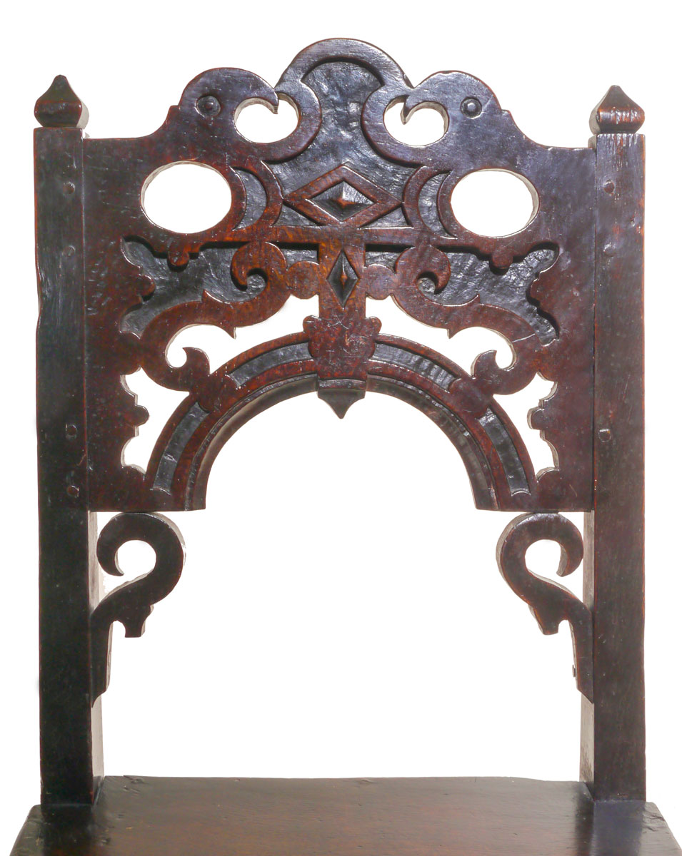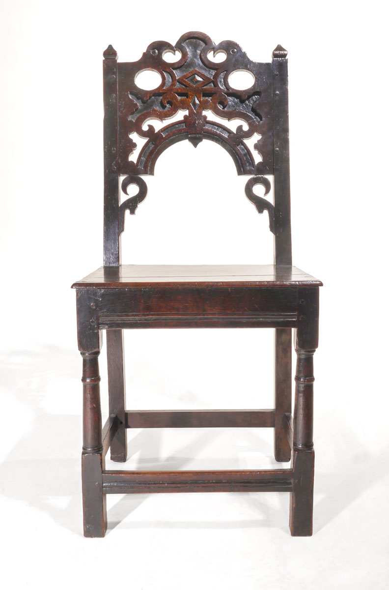 Often described as a Manchester Chair. The back has a distinctive geometric design, with an open crest at the top and finishing with an arch below supported on open side scrolls. The simple turned legs, with a single knop towards the top are joined with run moulded stretchers.