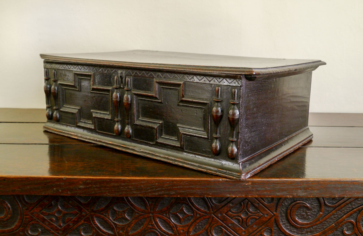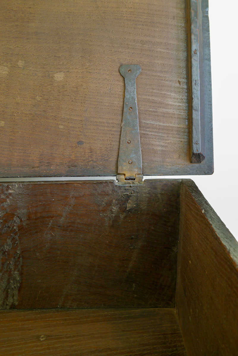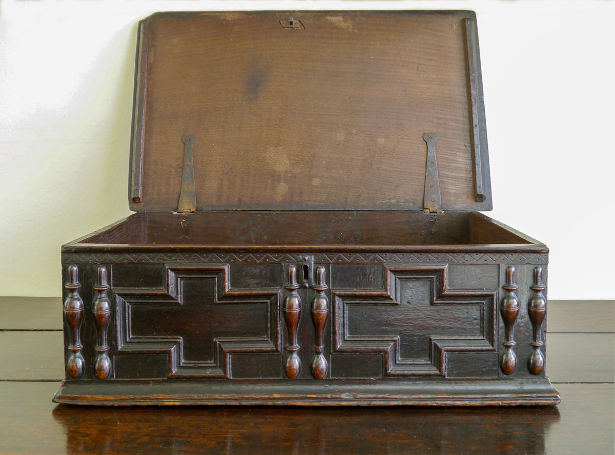 The top – formed from a single board of oak, and retaining the original strap hinges and bearers, above a fabulous geometric designed front. The two panels, decorated by mitred mouldings, are separated by beautifully turned split balusters, the centre pair just flanking the original iron escutcheon.
