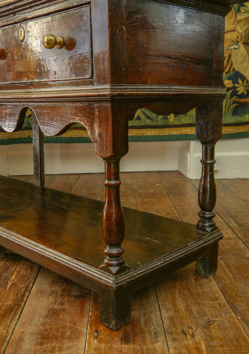 The base, with three drawers above a waist moulding, and deeply-shaped apron, which continues around the sides, supported on bold baluster-turned legs, four across the front and two to the rear. A sign of a slightly more thoughtful joiner – it is usual to find the back legs to be square-sectioned, and not turned.
