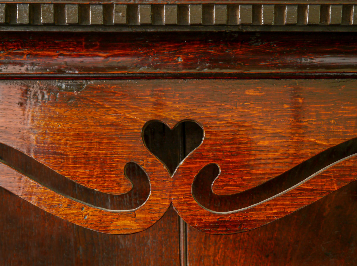 The rack, having a dentil moulded cornice, above a wonderfully shaped frieze pierced with hearts, above three shelves supported by sides decorated with scrolls and cupid’s bows. The bottom of the rack, with two spice drawers.