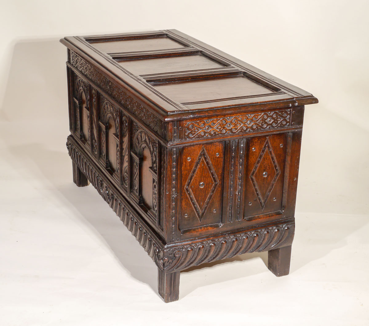 A superb early 17th century chest, with outstanding carved decoration, and in a totally untouched condition. This piece must have been made for a house of importance by a highly skilled joiner.