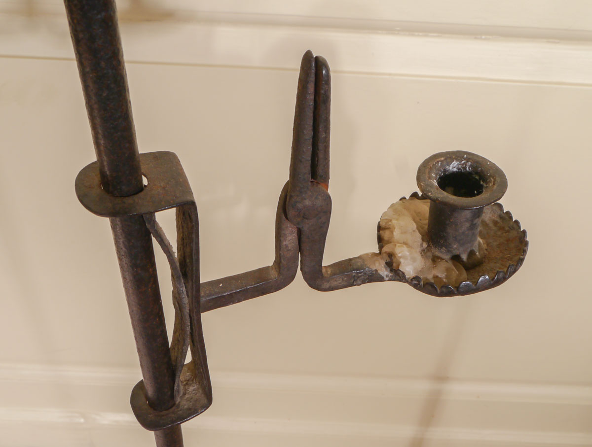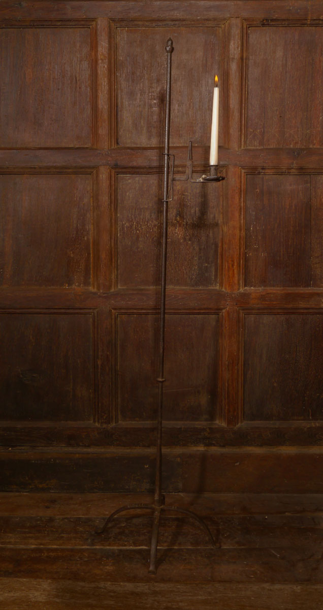 The stem, terminating in a well-defined acorn finial, above a circular shaft fitted with a spring adjustable bracket, supporting the rushnip and candle socket, below which is a grease pan, with a serrated edge. Towards the bottom of the stem is a discoid knop to prevent the bracket sinking too close to the floor.