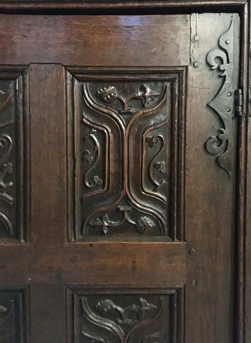 These panels would almost certainly have formed part of a large hall cupboard – possibly the ends which would have been made up of four vertical pairs. (See the example shown here from the Gruuthusemuseum, Bruges).
