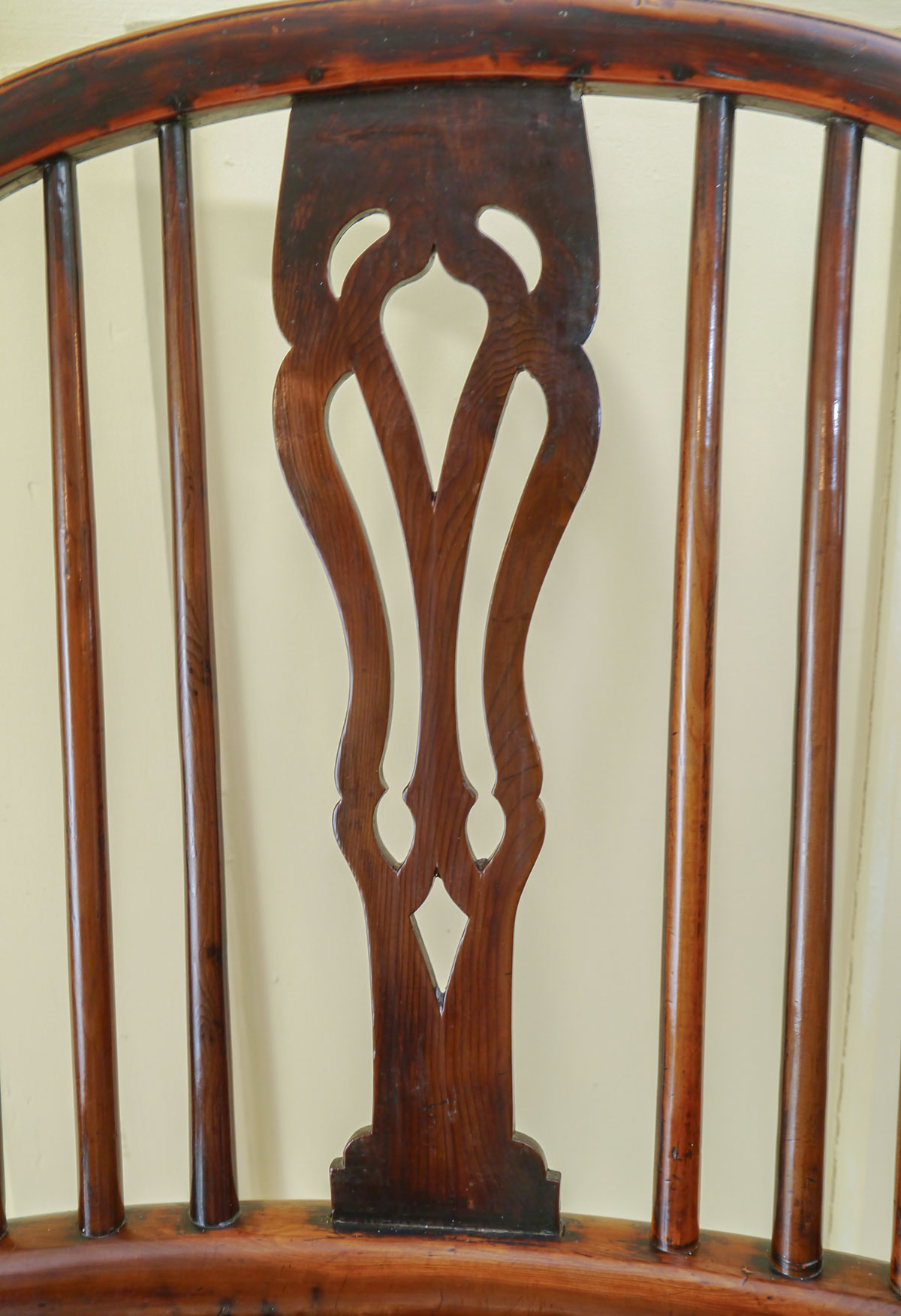 The high backs, with an incised line around the curved hoop and central pierced splat, flanked by four tapering “sticks”. The curved arm bow, supported on elegantly turned front supports, which are morticed into the well-figured elm seats. The finely turned legs are joined by a crinoline stretcher.