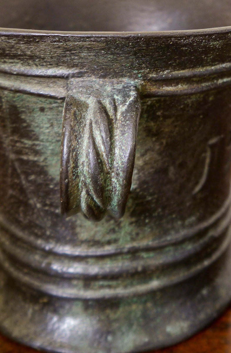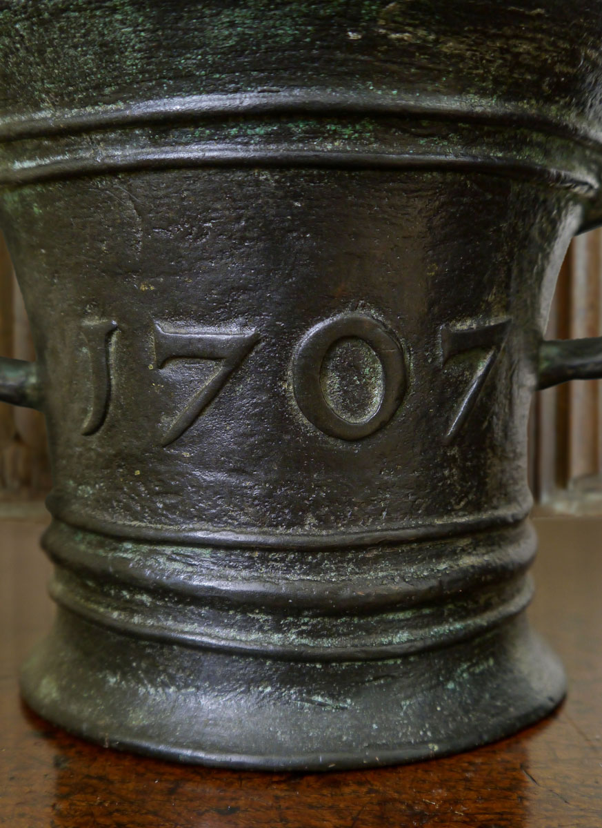 Having a triad of marriage initials N over R M, which are centred around a small heart. To the reverse is the date 1707. The body of the mortar has ring, or “wire” decoration around the top and base, the loop handles are decorated with a twist down the centres.