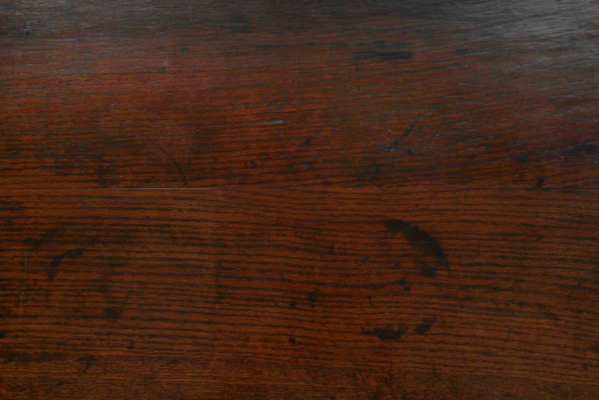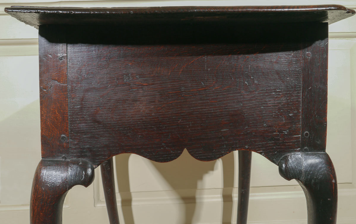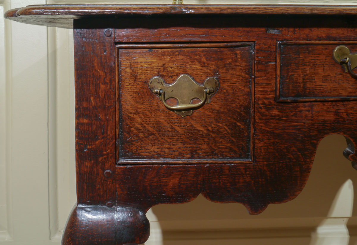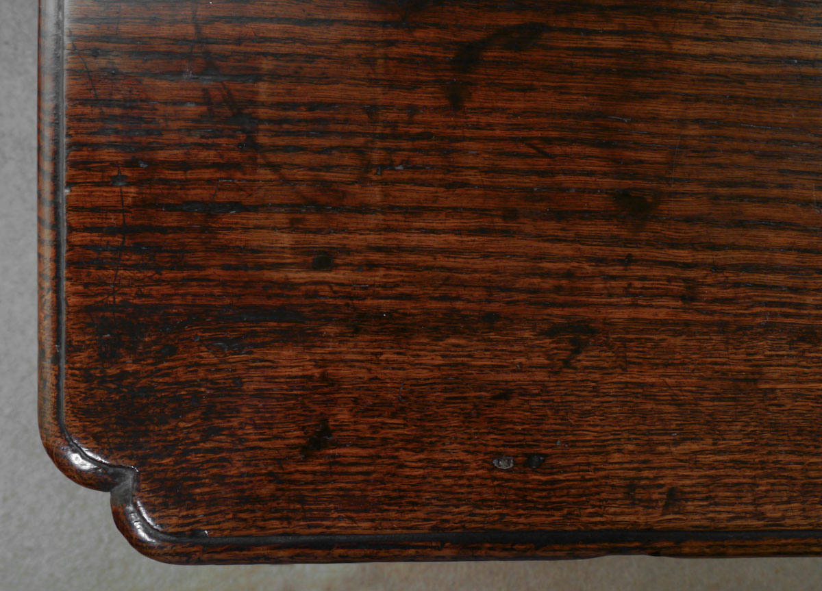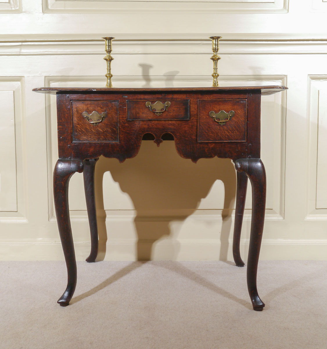 Having a two-plank top, which are cut from the same piece of timber and butterflied open (mirror planks), which have shaped “re-entrant” corners, above three drawers, all retaining the original brass handles, which are set into a deeply shaped frieze. The finely shaped cabriole legs have the original corner ears at the top, and terminate in well-shaped pointed toes. The cupid’s bow shaping to the front is repeated on the sides.