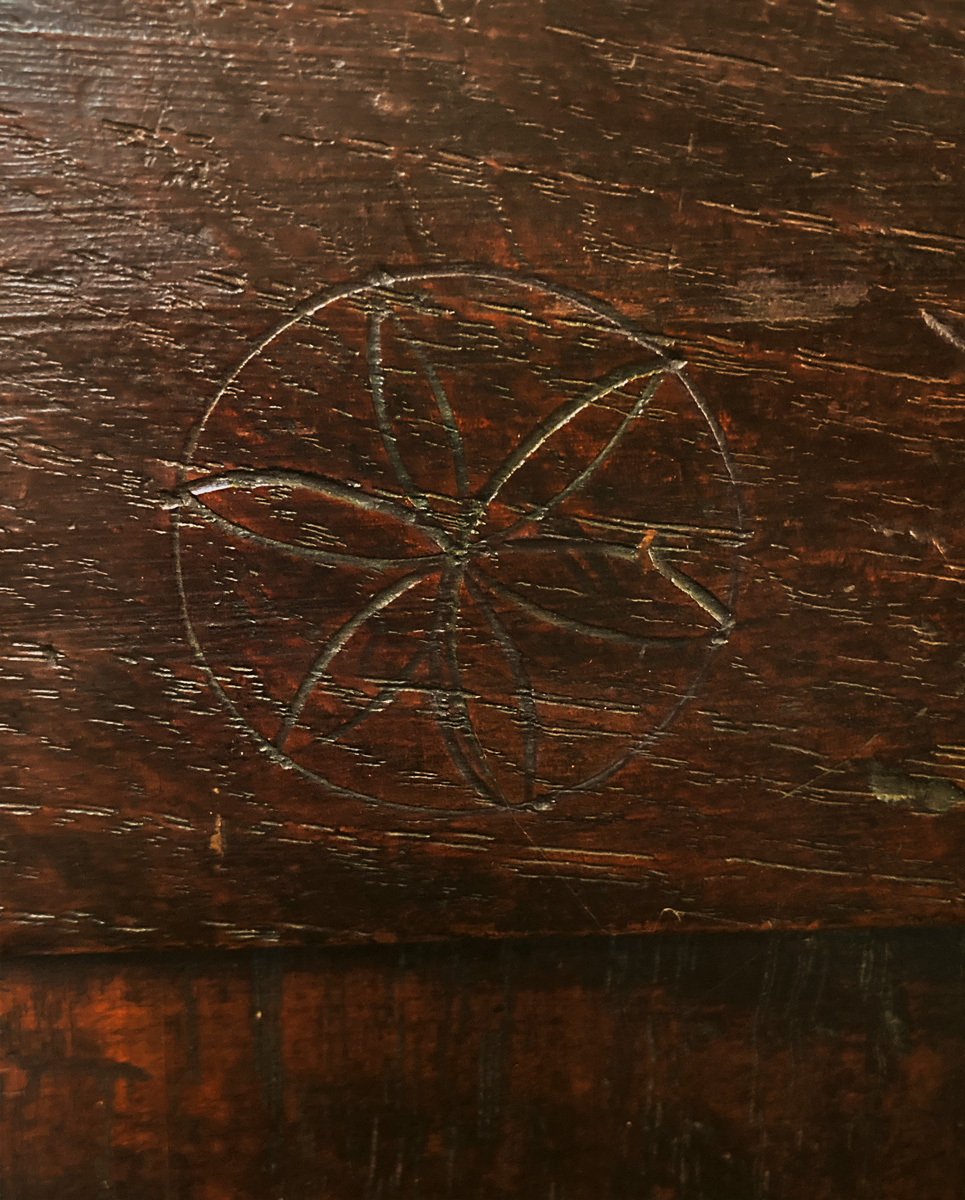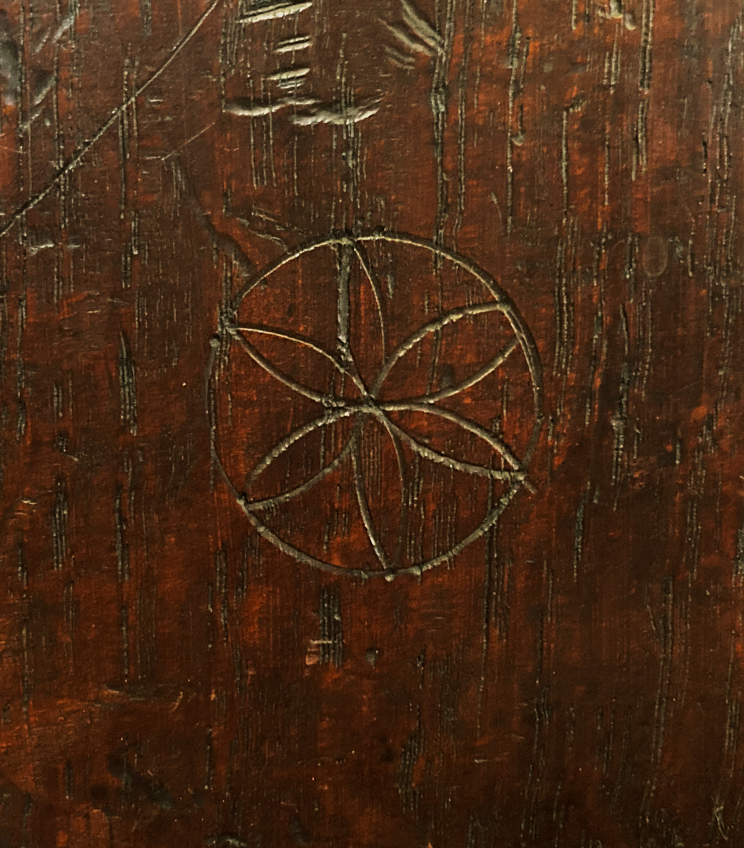 Most interestingly are the "witches circles" scratched into the inside of the cupboard door, and the deep tadpole-shaped burn to the front of the door, which it was thought would warn off evil spirits, which could put curses on the food (it was thought the evil spirit would rest on the circle and then become confused as it followed the trail round and round, and couldn't get off).