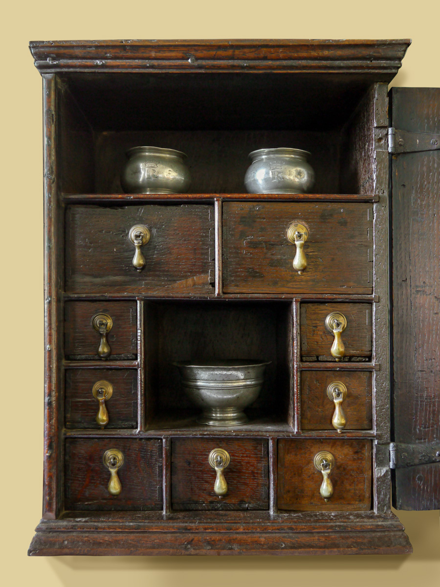 The door opens to reveal a fitted interior of 9 small drawers, all with their original brass pulls, set around a central compartment which would have housed a bronze mortar to grind the spices stored in the drawers. The full-length horizontal compartment at the top would have stored the pestle for use with the mortar, and possibly pewter bowls to mix the spices.