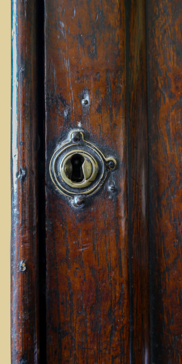 The front, formed as a single door, with a raised panel set into a morticed and tenoned frame, which retains the original lock, escutcheon and strap hinges, with "penny" ends.