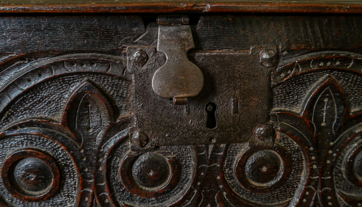 As is the norm of this type of table – or deed box – the top is boarded (in this instance a single piece of oak) with a double-reed edge moulding, and most unusually has the initials of the original owner ‘S V’ carved to the front just above the iron hasp and lockplate.
