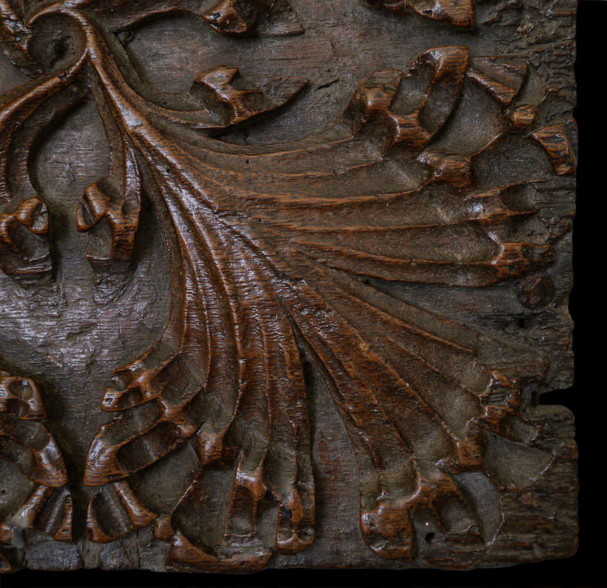 Carved with stylised leaves, emanating from a central whorl. The outer part of each leaf richly embellished with deep gouged carving and decorative scallops.
