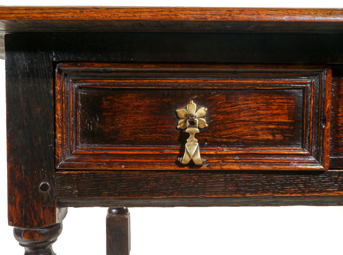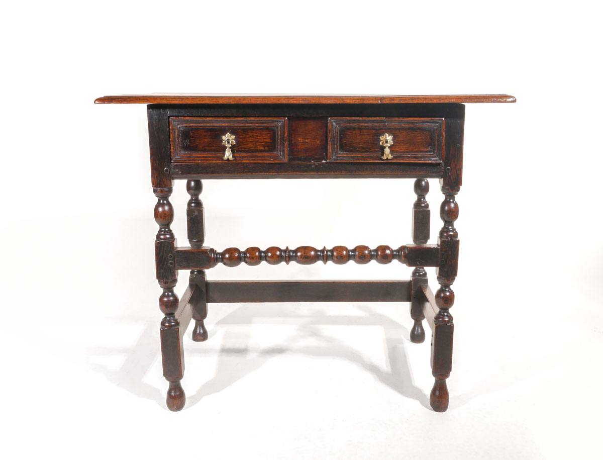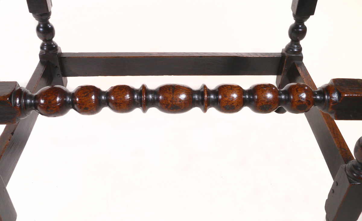 The moulded top above a single drawer (retaining the original brass drop pulls) with geometric mitred mouldings. The bobbin turned legs are joined by a high central front stretcher with similar bobbin turnings, whilst the side and rear stretcher are deep and plain.