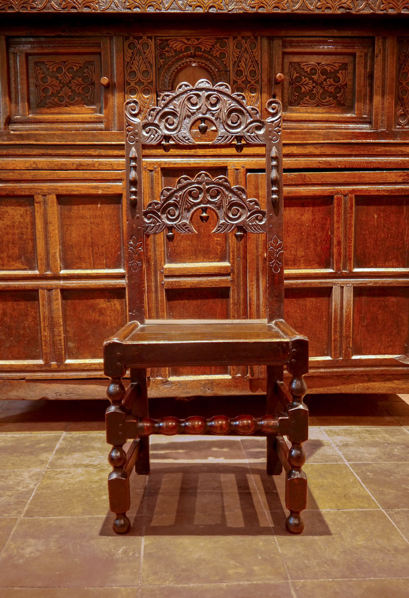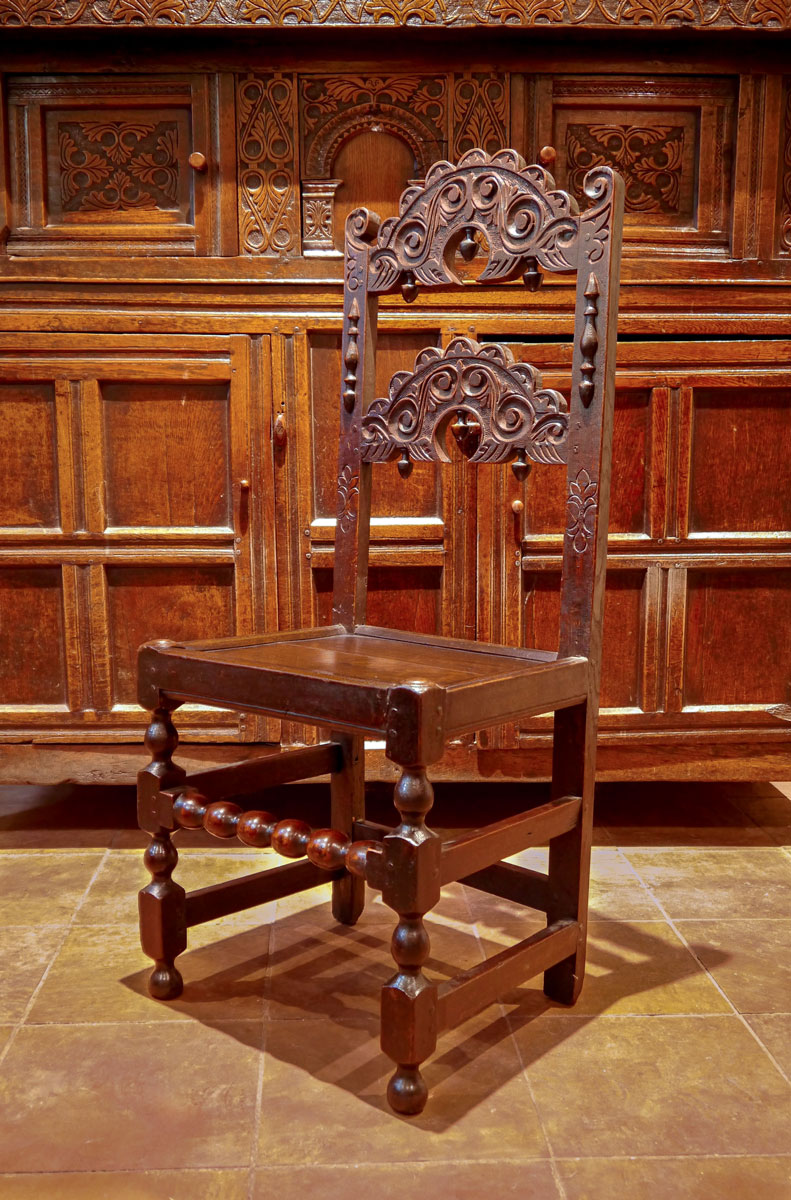 The centre of each splat has distinctive interlocking “S” scrolls, with a stippled, or matted, background. The bottom of the splats have the traditional distinctive outline, set around a central arch filled with dropping acorn pendants.