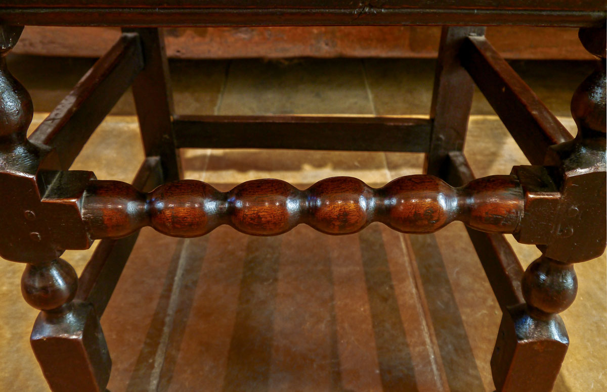 The uprights have the correct split baluster decoration, and are further embellished with little chip-carved ciphers. Inset panel seat contained within moulded rails, and supported on bobbin-turned legs, joined by a similarly turned cross stretcher, with integral button, or draught turning at the top, and the original onion feet at the bottom.
