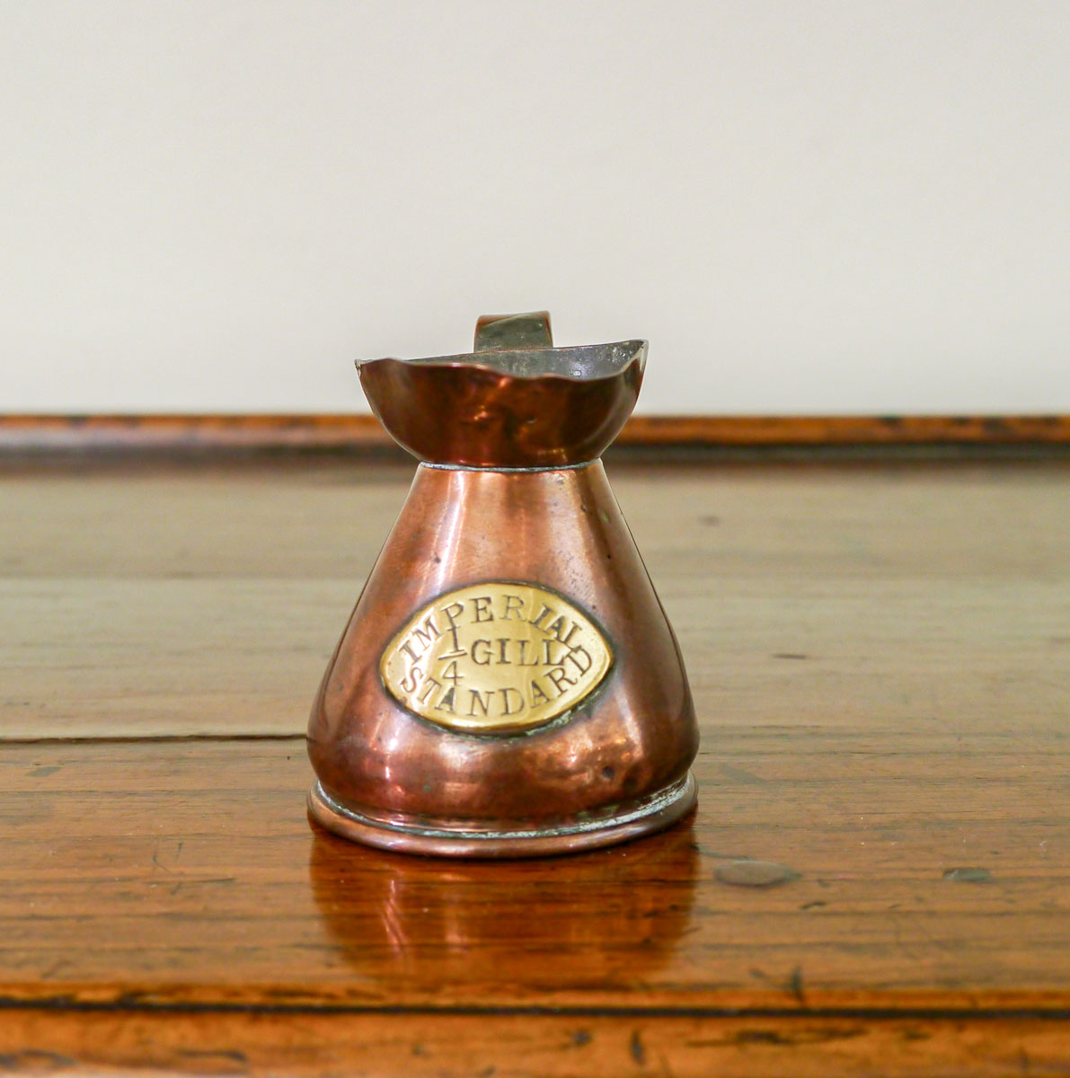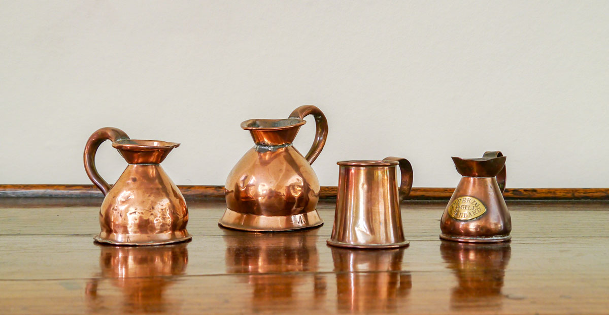 Three of haystack shape – a one gill, half a gill and quarter of a gill – and a straight sided measure with tapering barrel, which is a half gill.