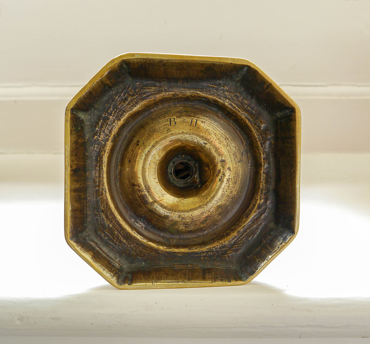 The stepped and raised foot is of the “cut corner” design, with a dished centre. Unusually, this candlestick has ownership initials engraved to the underside of the base – ‘B H’. The style of the engraving is very much of the period, suggesting these were the initials of the original owner.