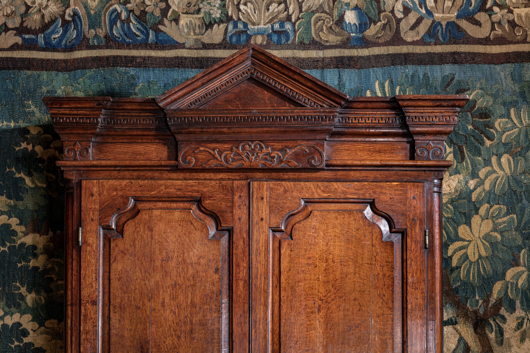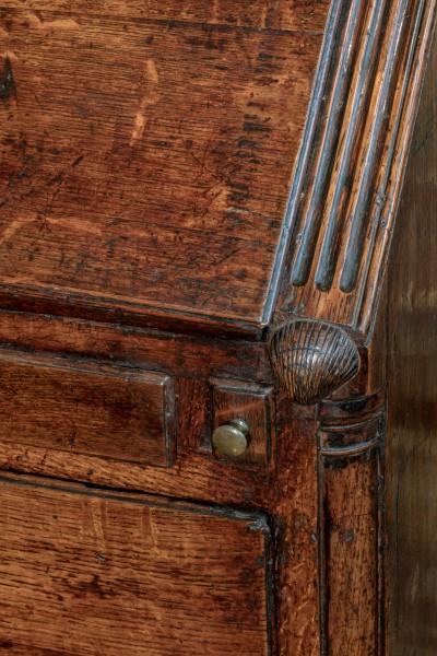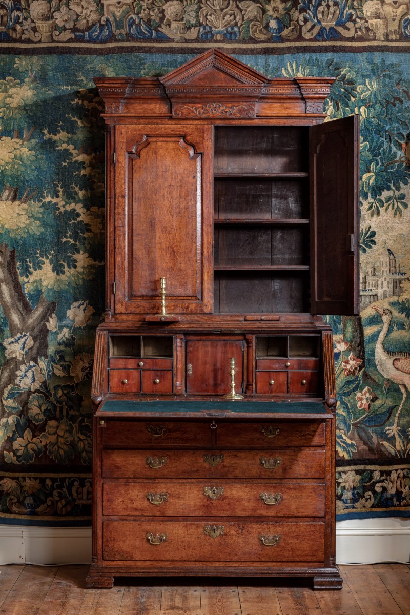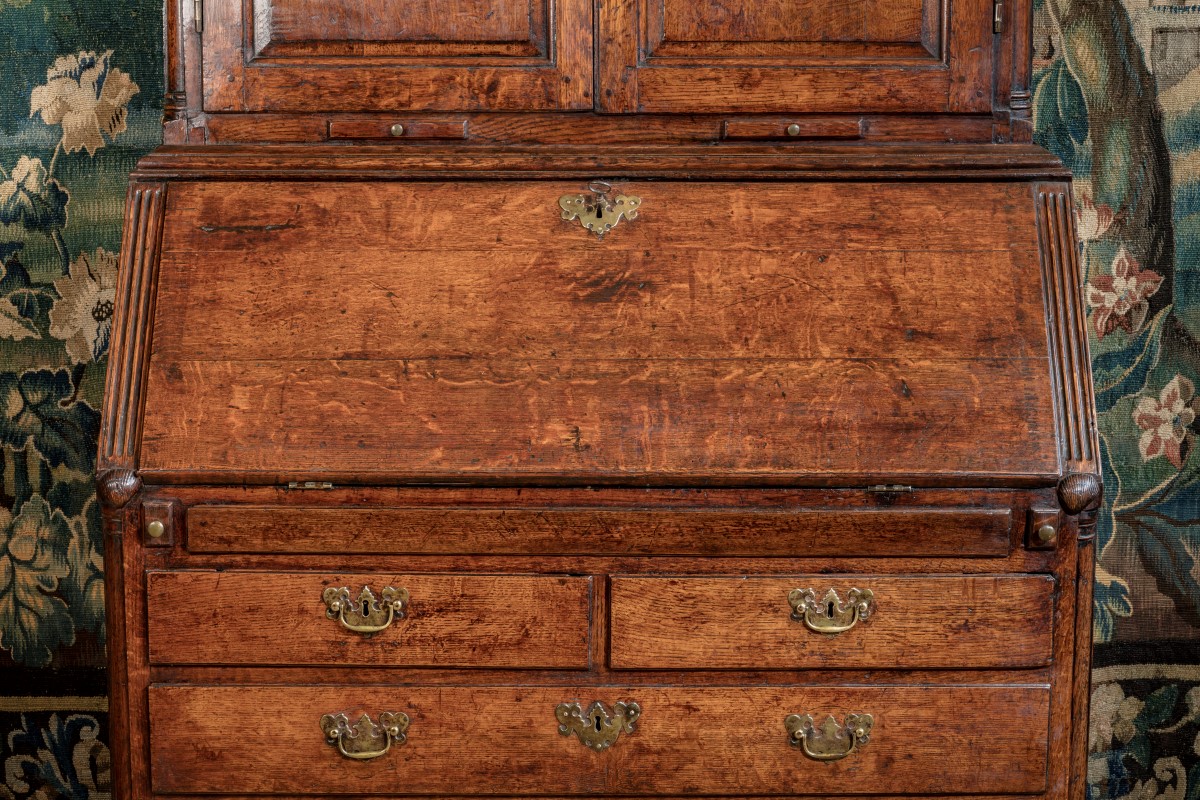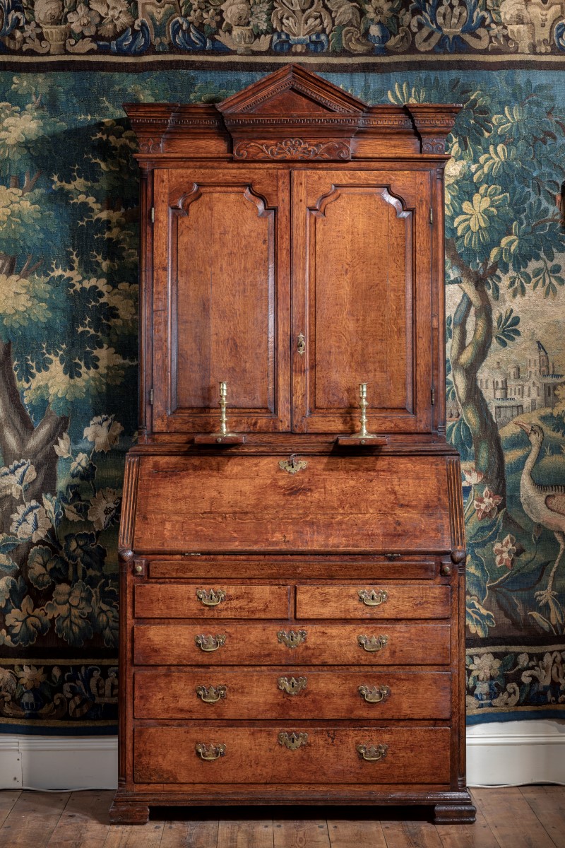 An impressive George II oak bureau bookcase. The top with architectural pediment and arabesque carving above well-shaped raised panelled doors, opening to reveal the original oak shelves. The bureau with a fitted interior made from yew and fruit wood containing numerous secret "sovereign" drawers. Standing on the original shaped ogee bracket feet. A wonderful piece of 18th Century furniture made in the North of England, circa 1725.