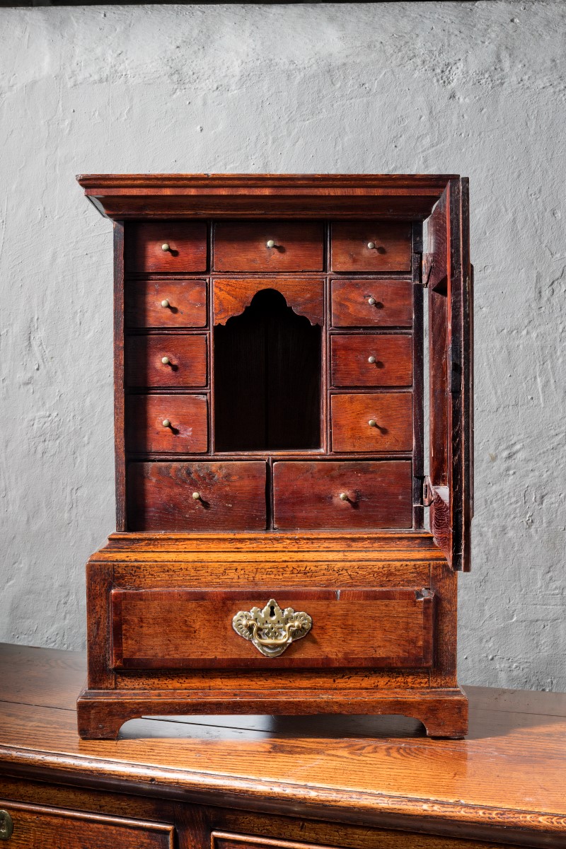 A magnificently proportioned George II oak table cabinet. A wide overhanging cornice sits above a door with a beautifully shaped panel which is crossbanded in mahogany to match the single drawer below. The interior is fitted with eleven spice drawers around a central arched niche, in which a mortar would have been kept. The wide waist moulding gives tremendous presence to this cupboard, suggesting it would have been used in a dining room, rather than a kitchen. Not only has the oak been lovingly polished to achieve a fine patina, but so have the original brass escutcheon and handle. The iron strap hinges are also original.