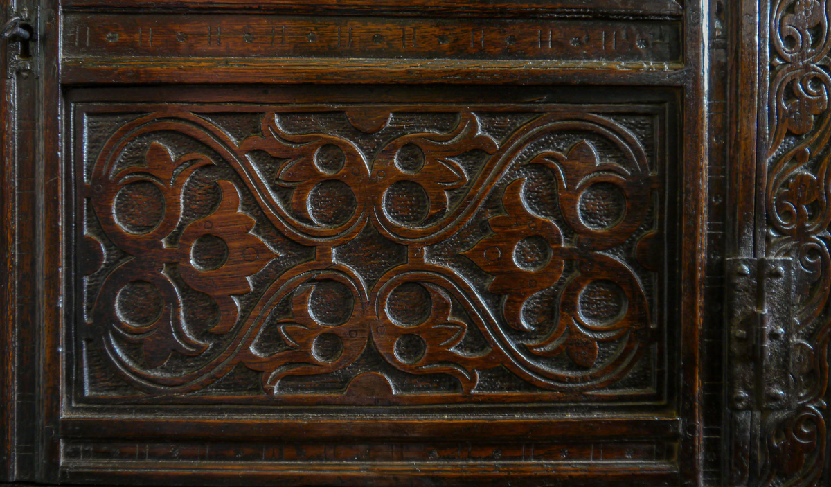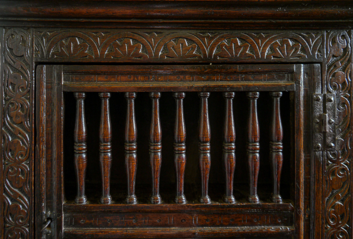 Having a single door, the upper section filled with 9 turned fruitwood spindles, above a well-carved panel, the pattern based on a series of interlocking 'C' scrolls, which terminate in stylised flowerheads.
