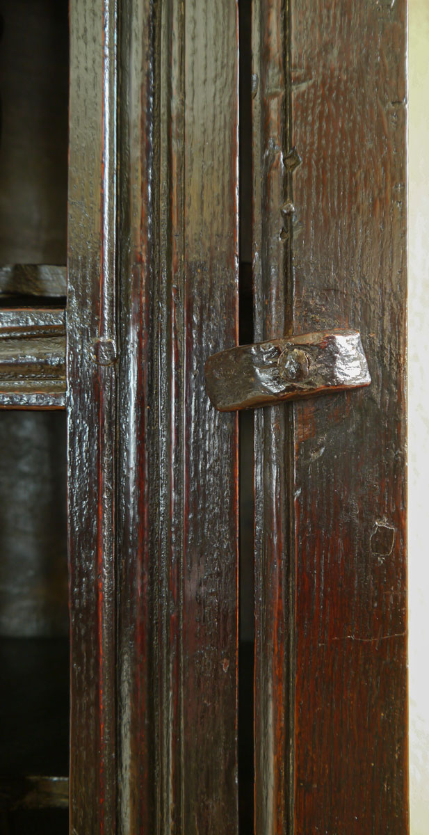 Having a moulded cornice above the single opening door, which opens on “pin” hinges and is divided horizontally into two panels, each filled with delicately turned spindles. The frame of the door is decorated with run-mouldings. When open there are two original shelves.
