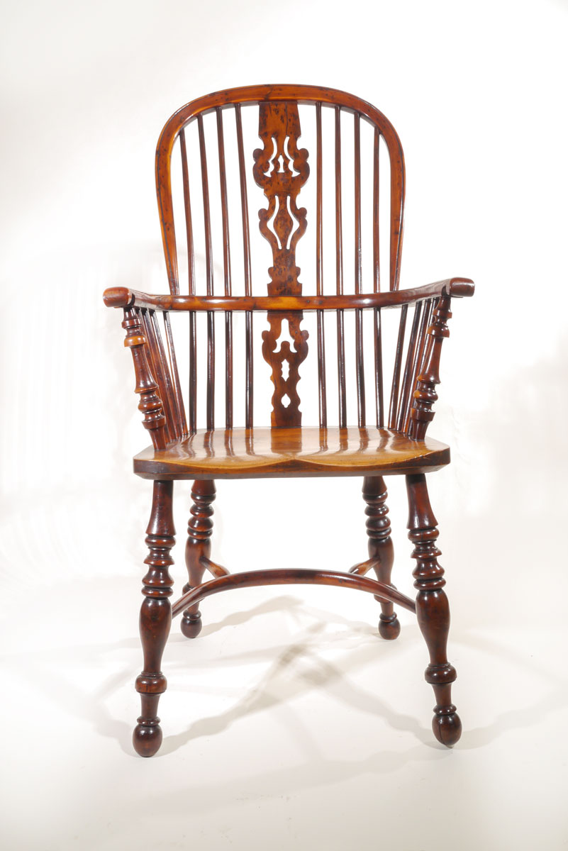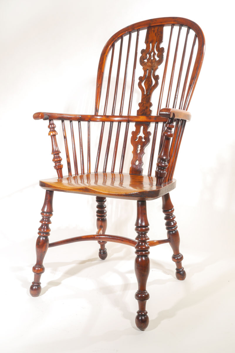 An impressive mid-19th century high back Windsor armchair, with decoratively pierced burr yew centre splat, standing on intricately turned legs, joined by a crinoline stretcher.