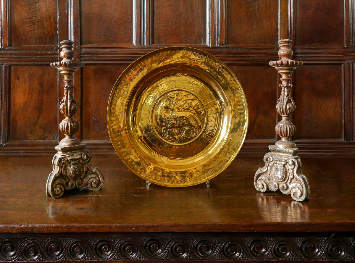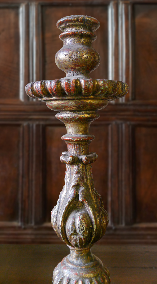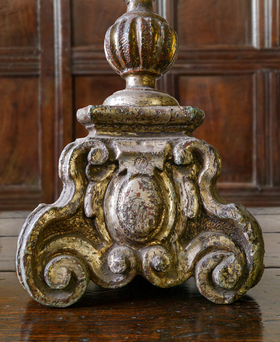 Having bold vase-shaped nozzles above stems carved with acanthus leaves and gadrooning. The spreading bases, with scrolled feet and central cartouches. The patinated silvered finish is over gesso (with the underlying terracotta colour just grinning through) and a carved wood base.