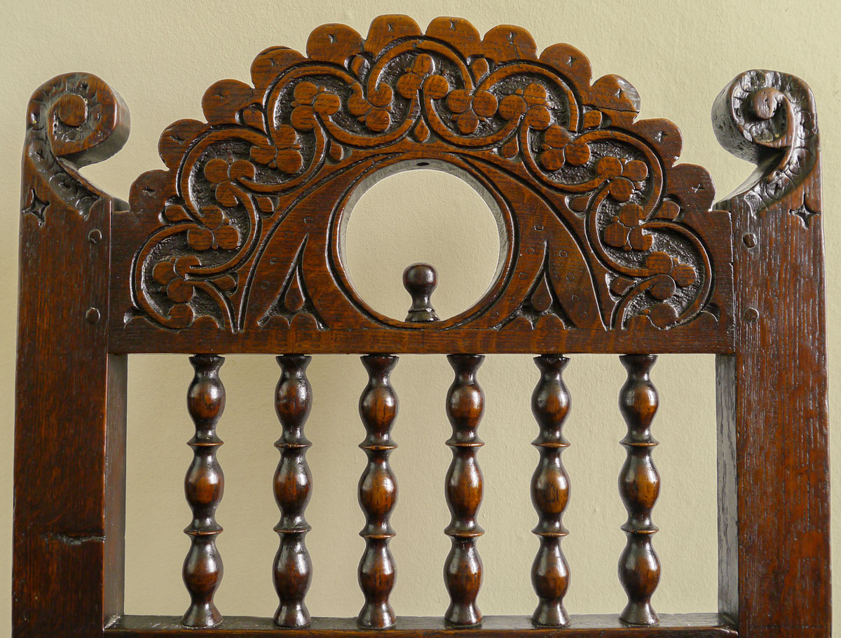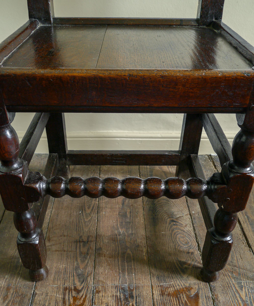 In this rare variation of the Yorkshire chair, the top splat, scalloped around the upper edge, is carved with an interlinking series of lunettes filled with a stylised flower design. In the centre is a pierced roundel with a small acorn finial. Between the top splat and the centre rail are a series of 6 turned balusters of a bobbin and reel design – often associated with the Yorkshire/Derbyshire borders.