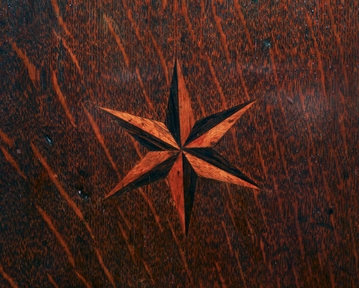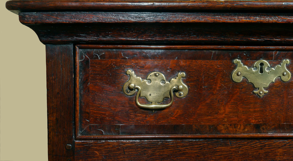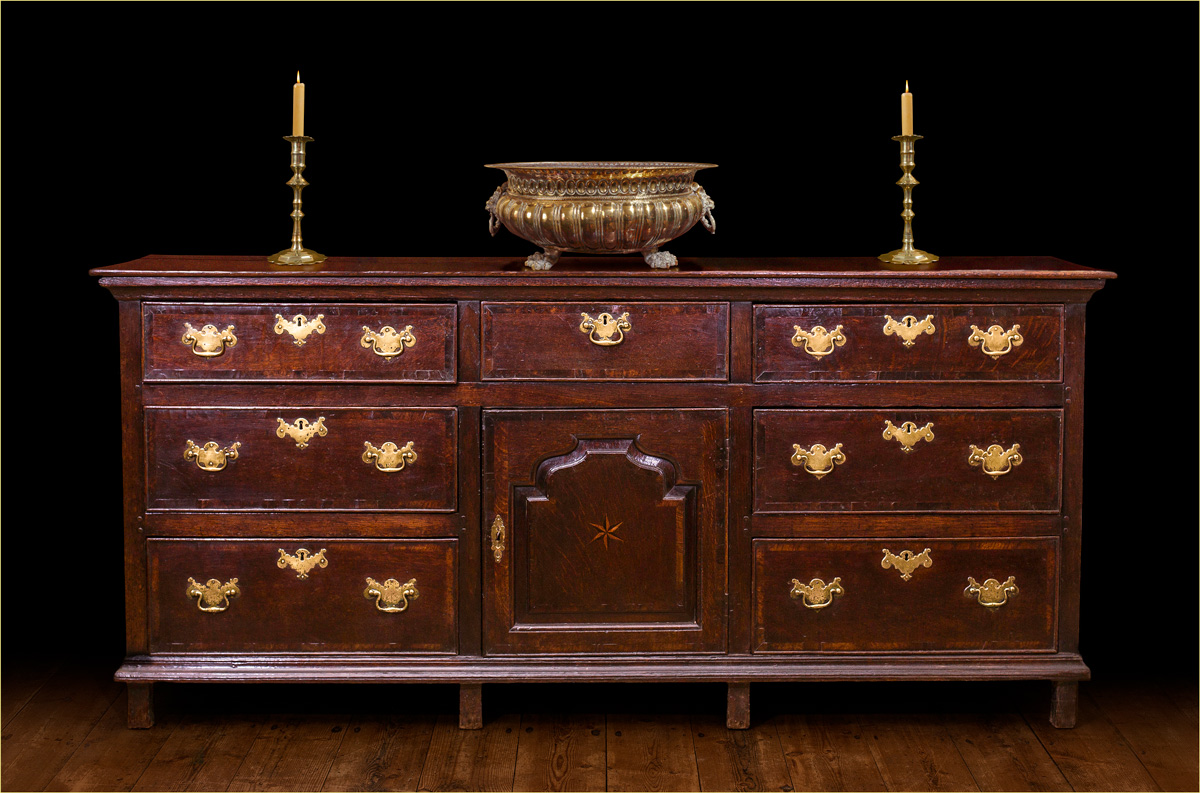 The two plank top, above a central cupboard, with a superb stepped arched and fielded panel door, the centre of which is decorated with a discreet inlaid star of boxwood and holly. Surrounding the door are seven oak-lined and cock-beaded drawers, all cross-banded in burr oak, which is repeated on the cupboard door. Around the base is a deep and heavy moulding, which continues around the front and sides. The dresser, which has single panel ends, stands on the original stile feet. The colour and surface are outstanding.