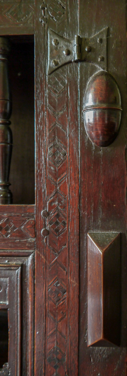 Having a boarded top, above a dentil moulding with bolection supports to the centre and outer corners. This decoration extends round each side, as does the panelled strapwork carved with stylised flowerheads around a central split “egg-shaped” turning.