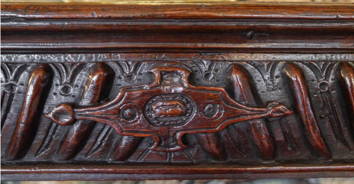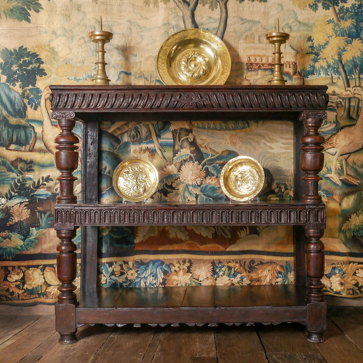 The boarded top, with moulded edge, above a gadrooned carved frieze, which continues around the sides. The centre shelf is again boarded above a rail with deep nulled decoration. The boarded bottom shelf sits above a rail with well-shaped bicuspid shaping, which again like the top and middle rail, continues around the edge. The outstanding features are the four magnificently turned supports. The two upper supports have a cup and cover design with central discoid turning and finish on a reel turned base, whilst the lower pair have a slightly simpler cup and cover design. The original front feet are a continuation of the supports. The rectangular rear supports have a simple vertical run-moulding.