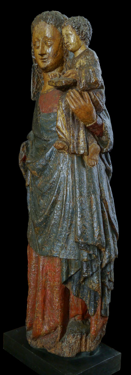 Mary, with a relaxed stance, one knee pushed slightly forward, and a gentle facial expression, holding Christ in her crooked left arm.