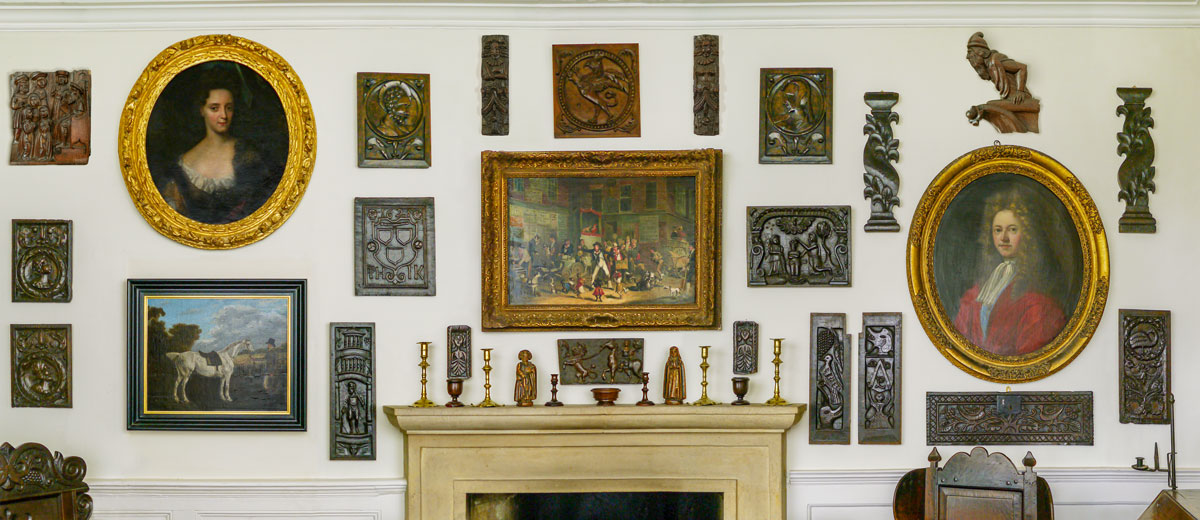 An eclectic collection of paintings, carvings, sculpture and metalware from the 16th to 18th centuries give interest to a wall in our drawing room.