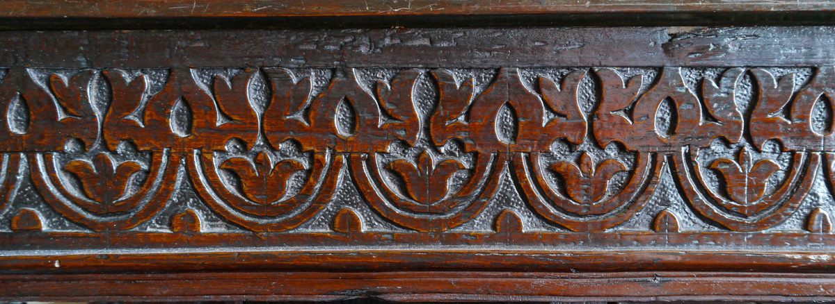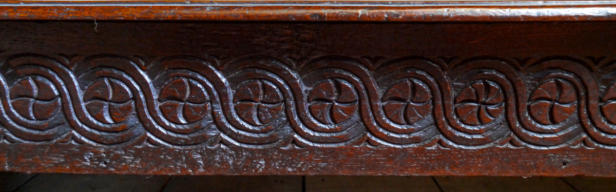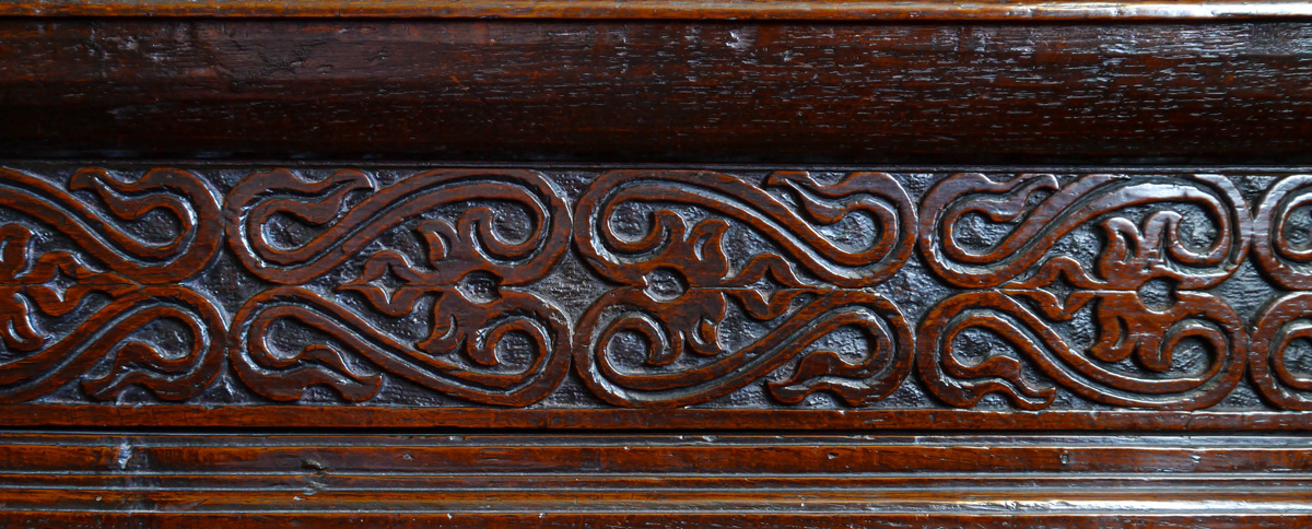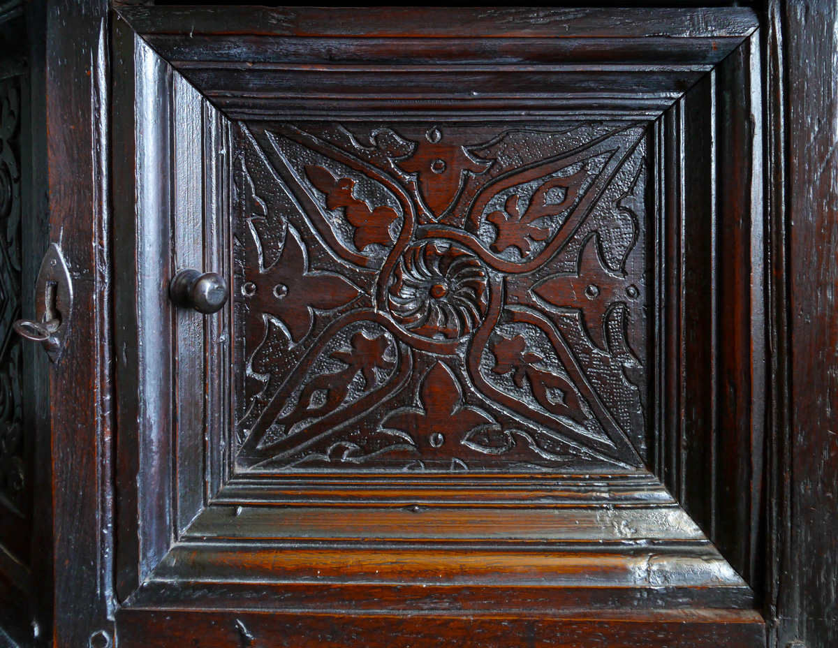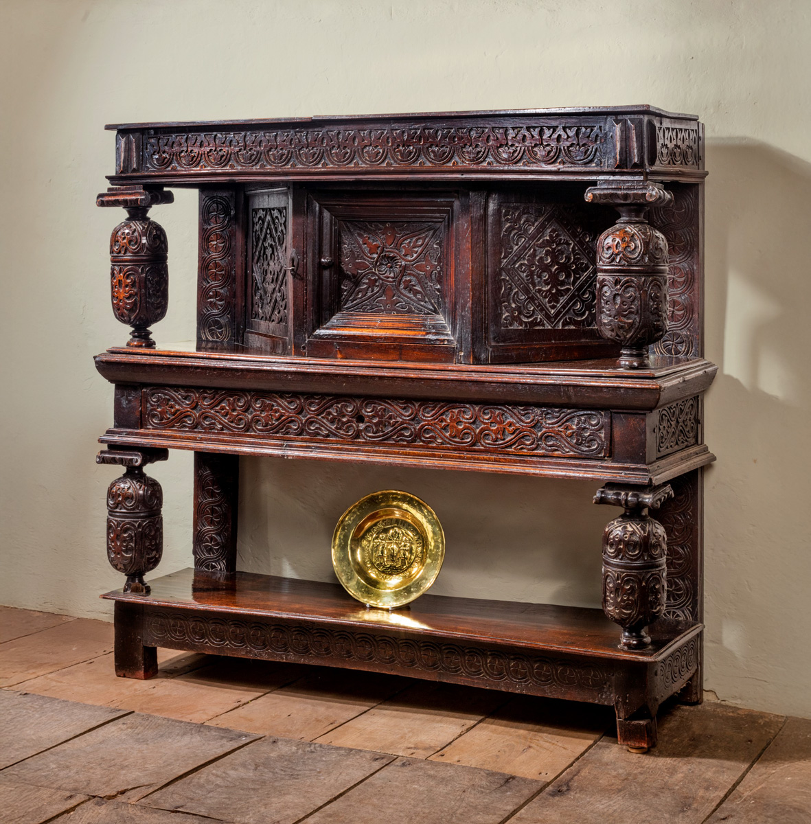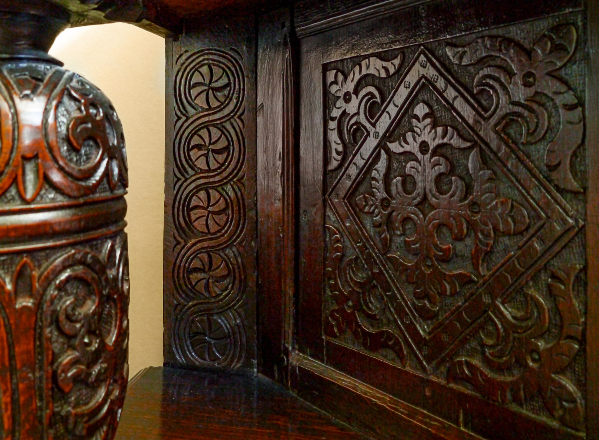 A fine James I oak standing cupboard. The single piece top, with strapwork carved frieze, with triangular boss embellishments. The enclosed cupboard with panelled door, with canted sides, all carved with typical Gloucestershire motifs. The frieze drawer above an open under-tier, which again has a single piece potboard. The bulbous turned front supports ornately carved with floral motifs.