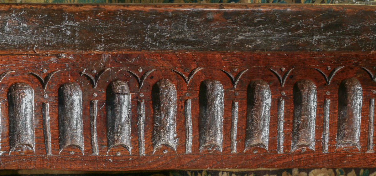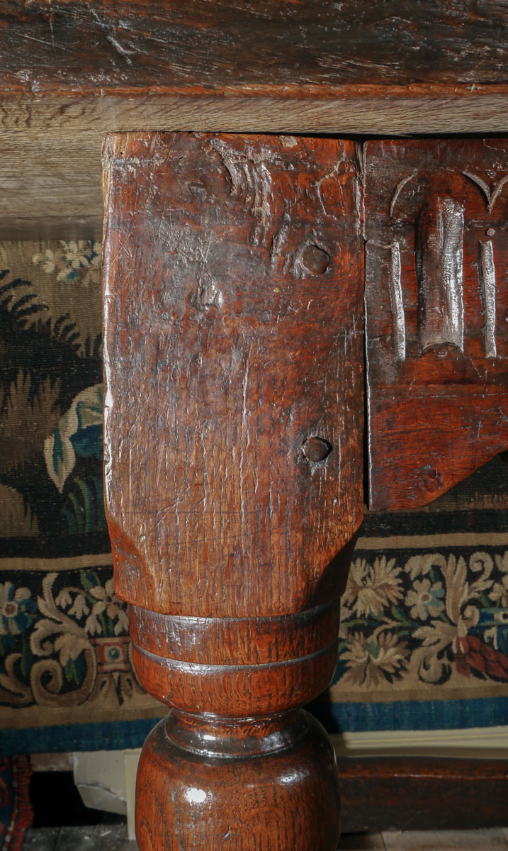 The quintessential joined oak refectory table. The thick two-plank top, with cleated ends, supported on heavy cup and cover turned legs. The top rail, with integral corner brackets, is carved with a symmetrical gouge or nulled design. The two end rails have the same shaped brackets, which give a most pleasing line, whilst the back rail is plain. The legs terminate in square blocks, which are joined by heavy stretchers, the corners of which have 18th century iron reinforcement brackets.