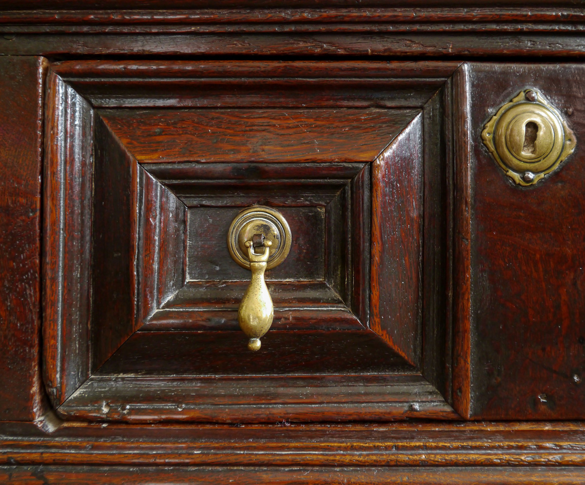 Having the most beautiful proportions, the twin boarded top, secured to the under rails by small oak pegs, retains the original moulded plate rest, set 4 inches in from the back edge, and the whole top is finished around the top with a deep ovolo moulding.