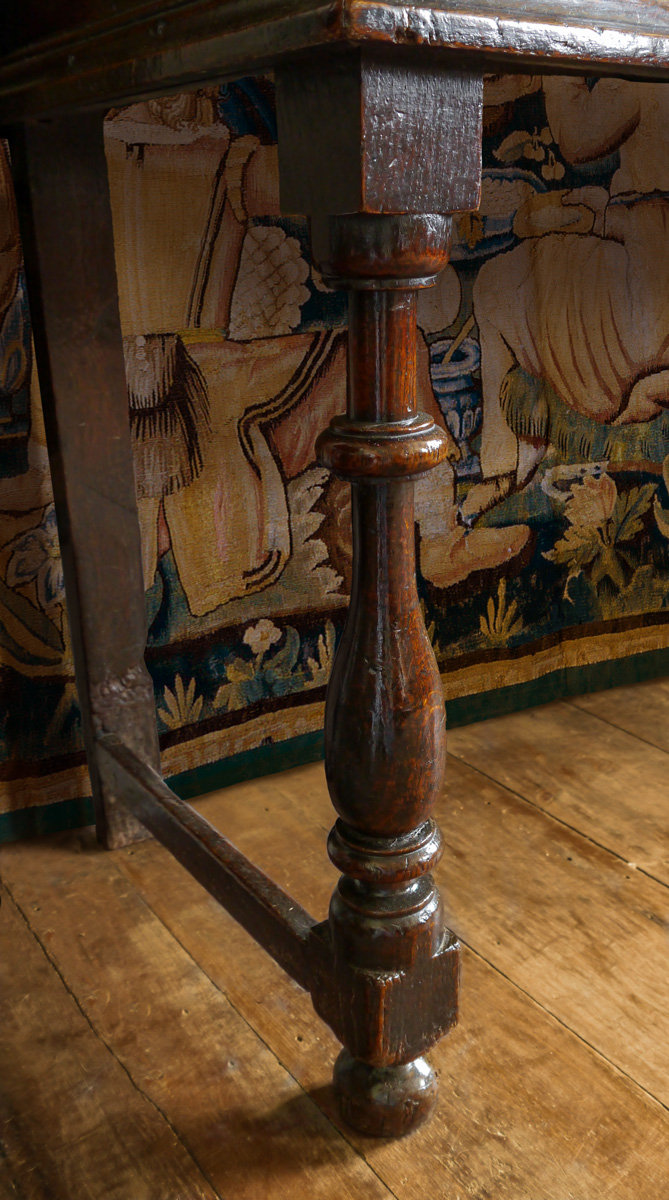 The inverted baluster-turned legs are of the most elegant form, embellished top and bottom with ring turnings finishing with the original turned toes. The side stretchers are again original.