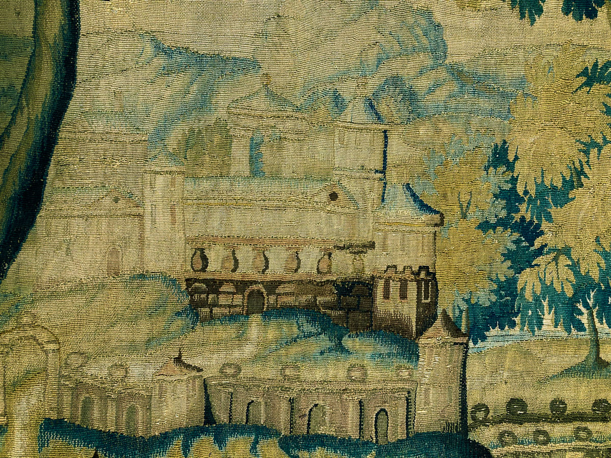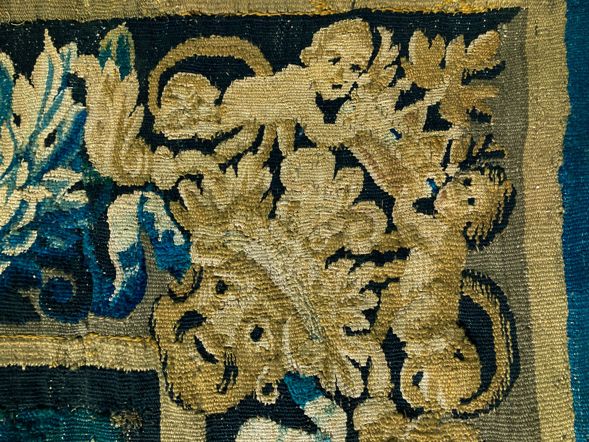 The tapestry retains its original border of trailing flowers and fruit, with cherubs holding a crown above a lion’s head in the top corners.