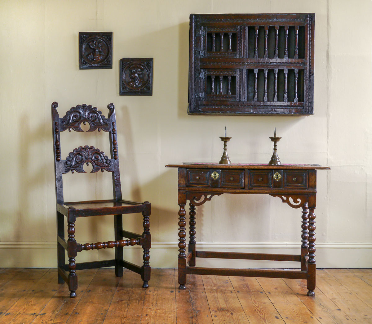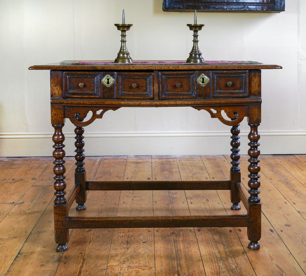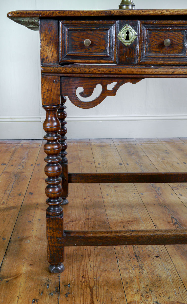 The two plank top above a pair of geometrically moulded drawers, with pierced corner brackets below. The bobbin and reel turned legs terminate in the original “cup” toes and are joined with plain all round stretchers. The table has a lovely nutty brown colour with exceptional patination.