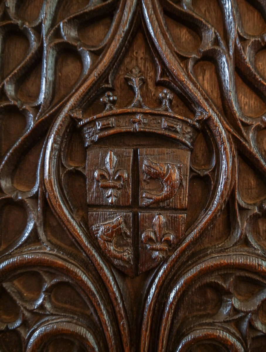 The centre of the panel has a very complicated pattern of scrolls enriched with fine intricate detail, leading up a to a wonderful crowned crest, or shield, with fleurs de lys and stylised sea creatures - perhaps dolphins.