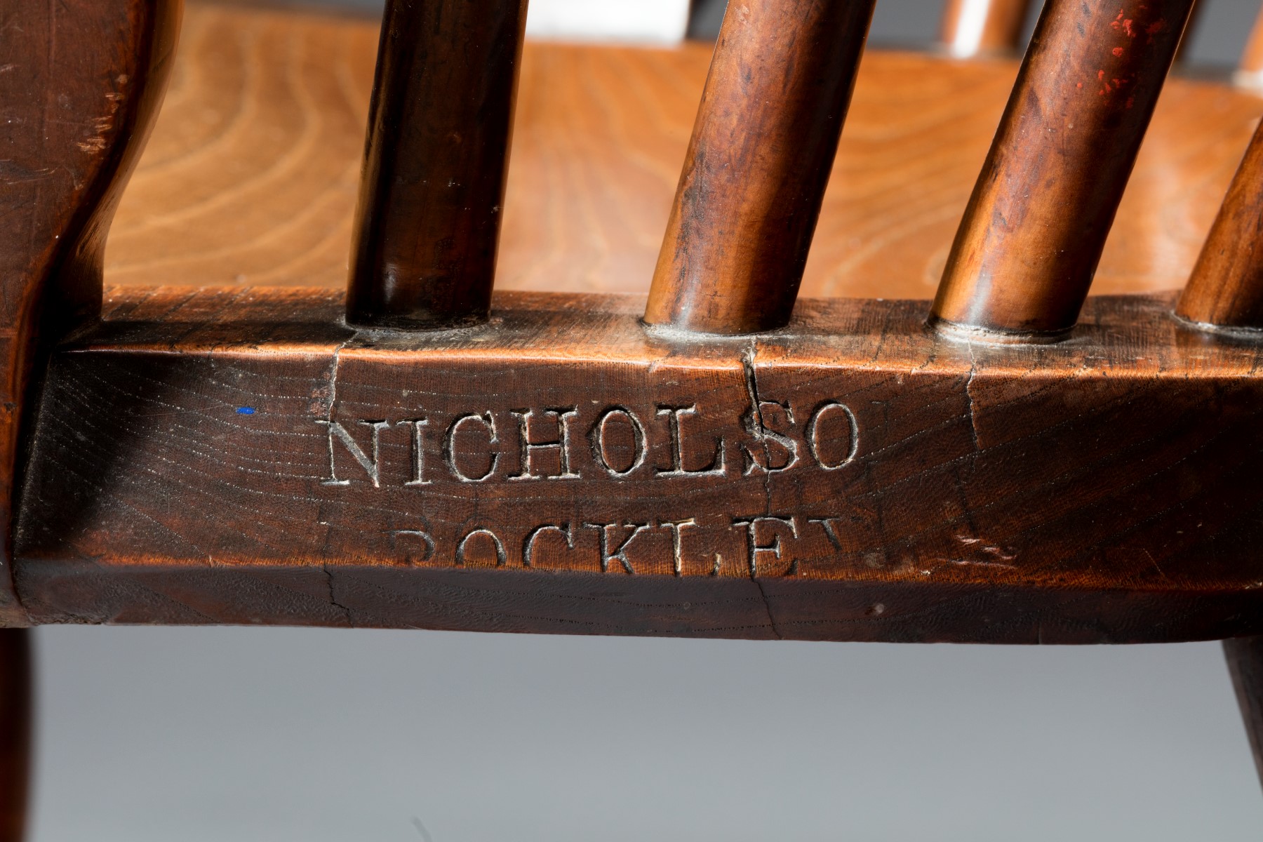 George Nicholson took over the Rockley workshop started by William Wheatland around 1830, and this example will have been one of his earliest chairs. The use of the flattened and curved underarm supports, together with the simple single turned leg, pre-dates the more complicated turned arm supports found on later chairs. It is very unusual to find any chair with the curved arm supports, bearing a maker's name, making this chair academically very important as it ties this design to a maker and area. It is the only stamped chair of this design I have owned.