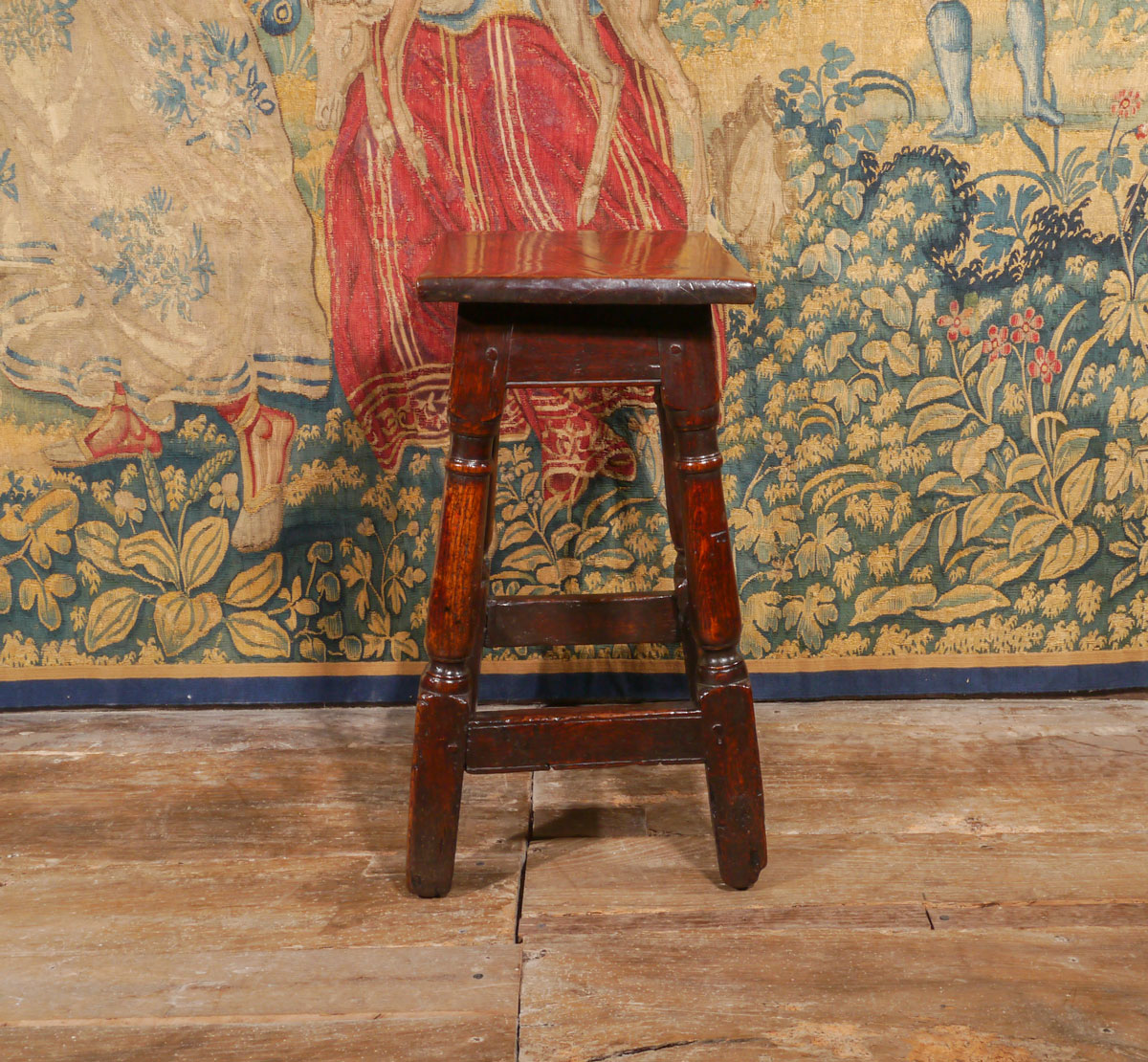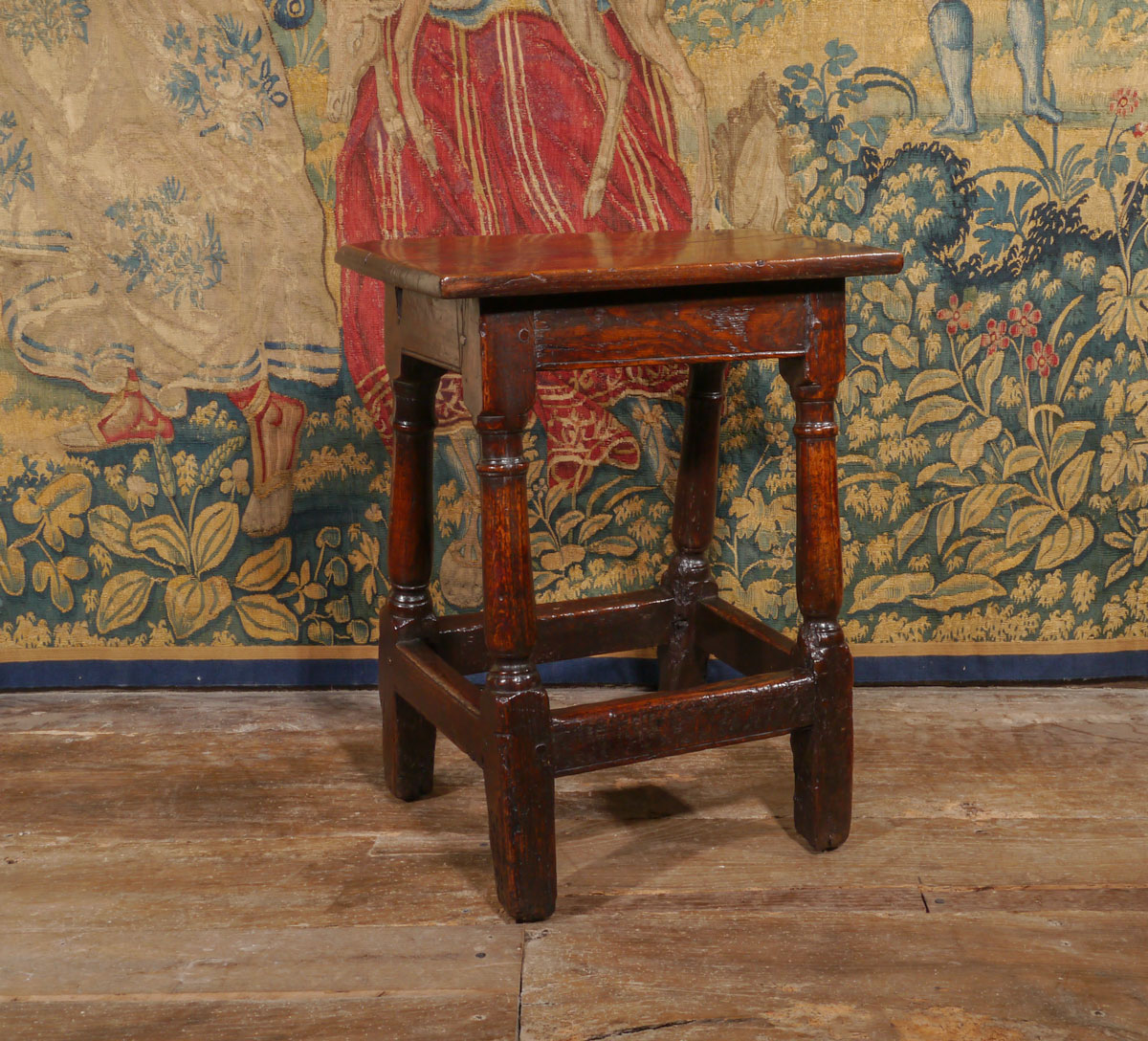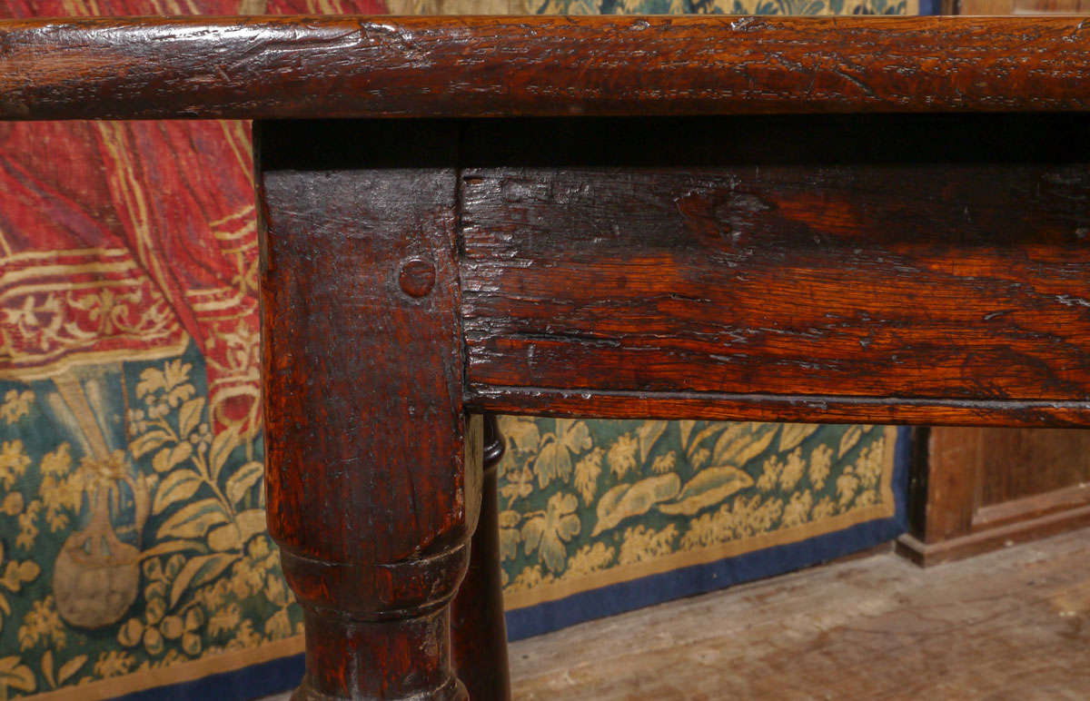 The square edged top – similar to the tops of 16th century boarded stools – is secured by four square pegs into a plain frieze with a simple moulding along the bottom edge. The heavy simple baluster-turned legs are joined by sturdy stretchers set high on the squared toes.