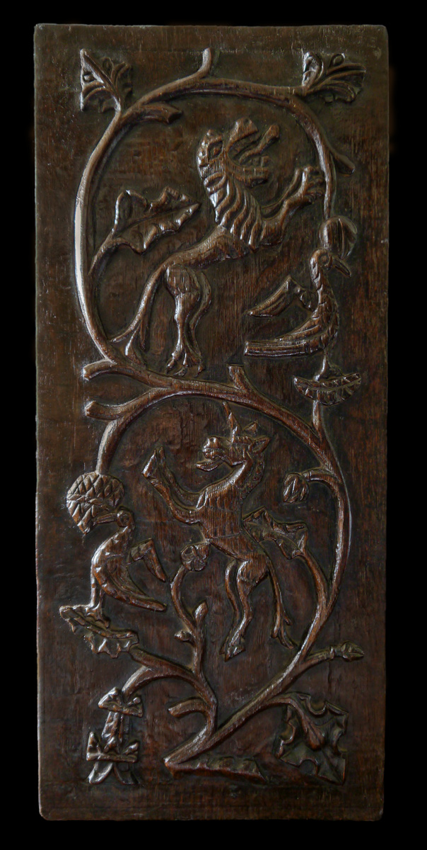Both of rectangular form, the first panel has a horizontal scrolling leafy stem, with a wonderful standing lion in the upper half. Below, and facing in the opposite direction, is a unicorn, again in a standing position. A couple of birds – perhaps storks (the stork, heron and crane are all symbols of love, hope long life or prosperity) – are carved amongst the foliage.