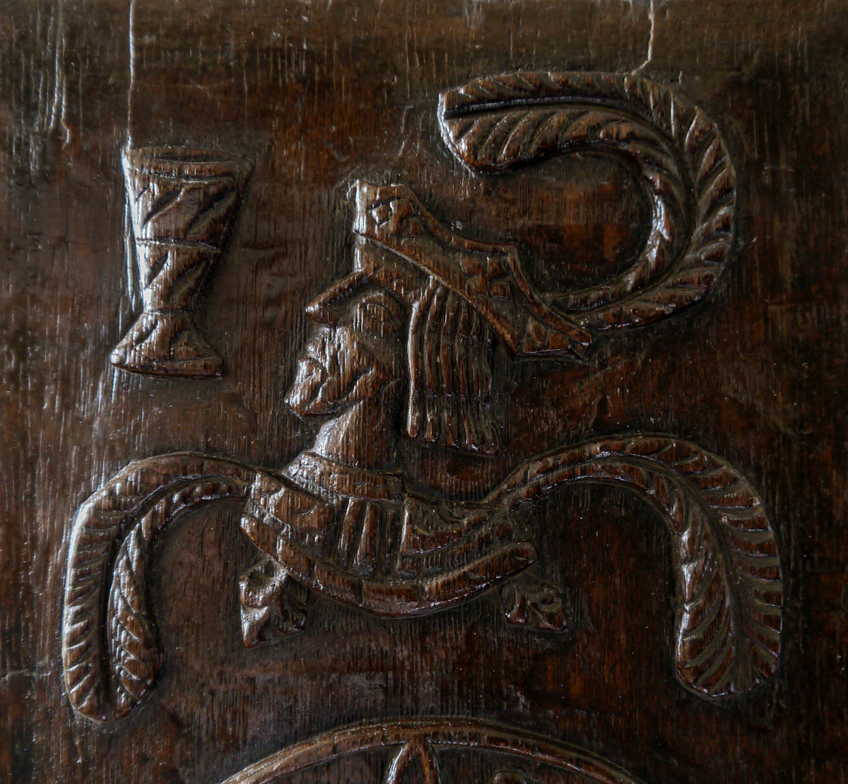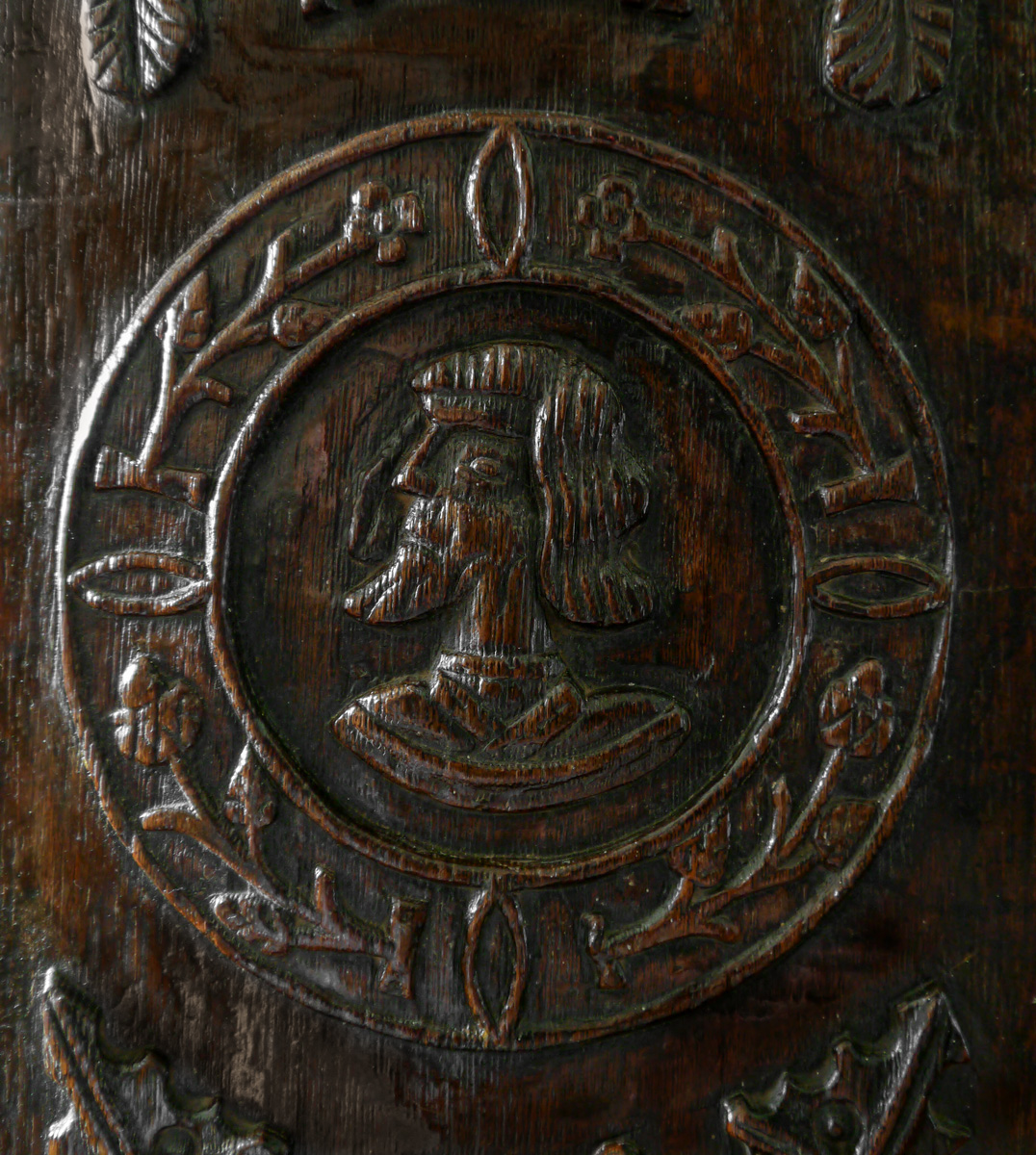 The second panel has portrait of a bearded gentleman within a circular foliate border. Above is a second portrait, this gentleman, looking quite aloof, sports a fantastic Tudor cap, with ornate feather decoration, looking longingly at a beaker, possibly pewter, and in his mind full of mead.
