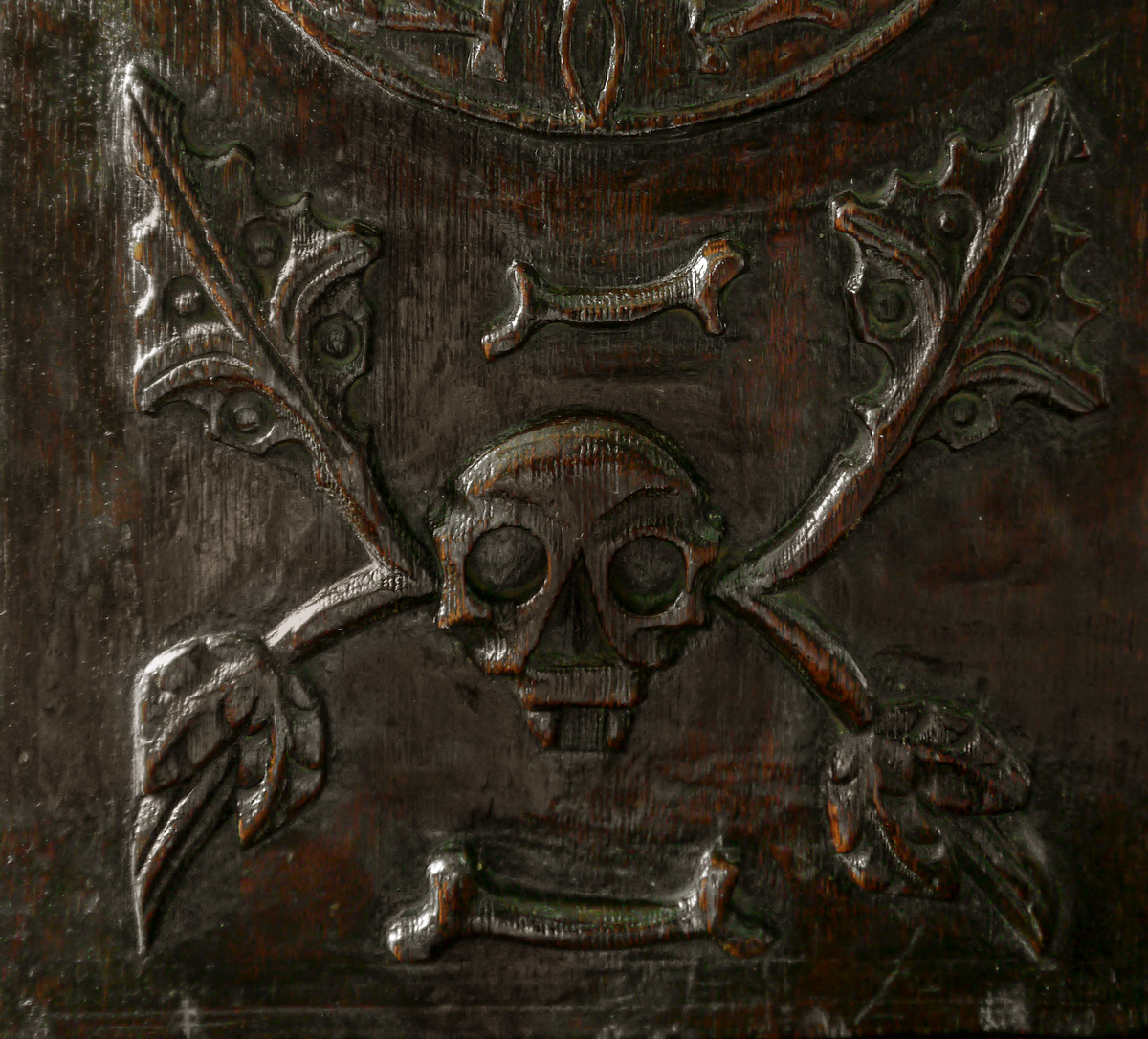 Below the two portraits is a tremendous depiction of a momento mori. A phrase and symbol, which when translated says “remember you must die”. This isn’t meant to be morbid or depressing, merely a reminder to make the most of each day.