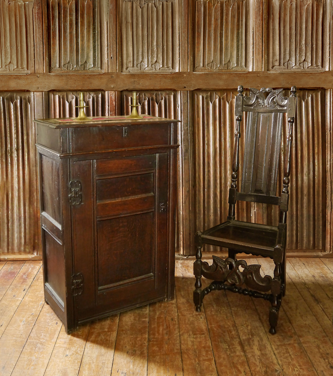 The back is formed from four thick heavily chamfered oak panels, set into a simple workmanlike frame.