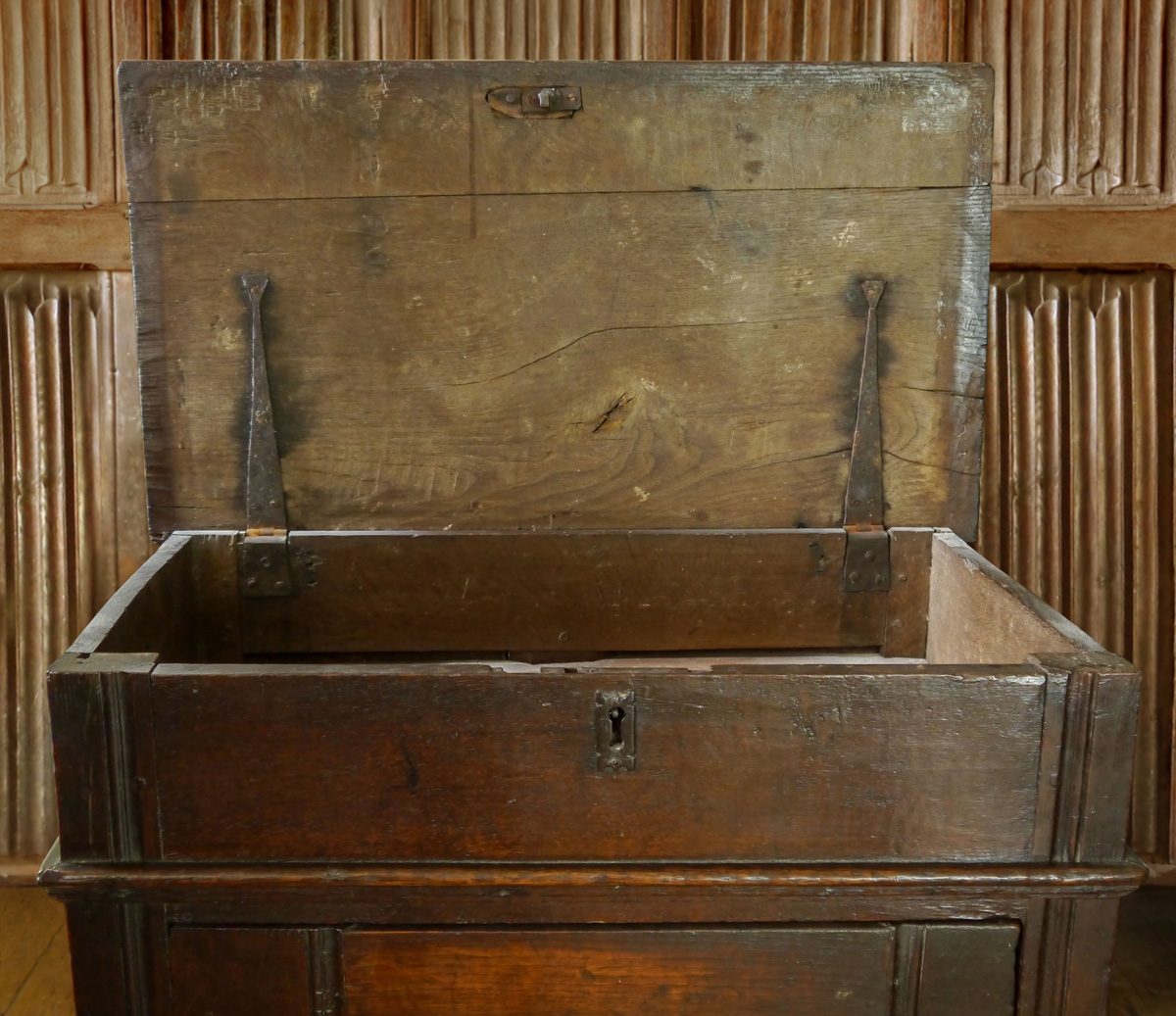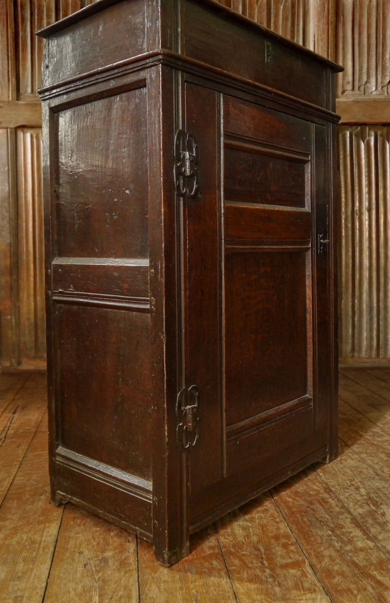 The boarded top, with moulded edge, lifting to reveal a shallow compartment with a beautifully figured elm base. Beneath the top rail - which retains the original iron escutcheon - is a good "waist" moulding, sitting just above the single two-panelled door, again retaining the original escutcheon, and fabulously shaped iron 'H" hinges. The door opens to an interior of a single full shelf made from a single well-grained elm board, and a lovely little "run around the edge" shelf supported on small shaped brackets. All vertical and horizontal rails are run-moulded.